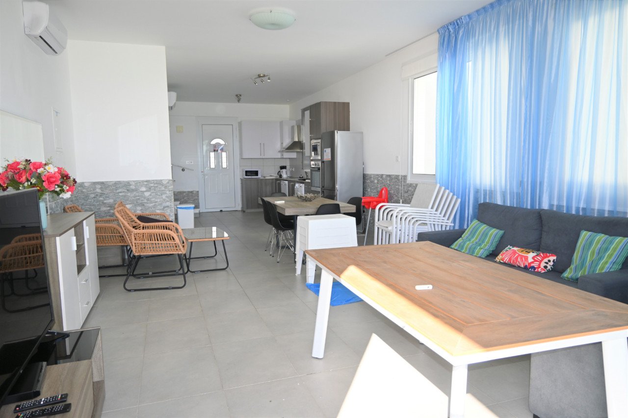 Cozy indoors consists of 120sq.m and 3 bedrooms on the first floor which one of them is master En-suite bedroom. Moreover there is a communal family bathroom. On the ground floor there is a guest bathroom and an open plan living area and kitchen. Outside there is a garden place and a private swimming pool offering views to the endless blue of Mediterranean Sea.