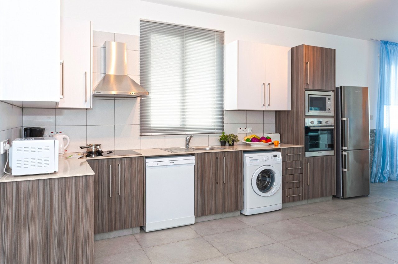 The fully-equipped kitchen features modern appliances and ample storage space, making meal preparation a breeze. The villa has three spacious bedrooms, all with comfortable beds and plenty of storage space. The master bedroom has an en-suite bathroom, while the other two bedrooms share a family bathroom.