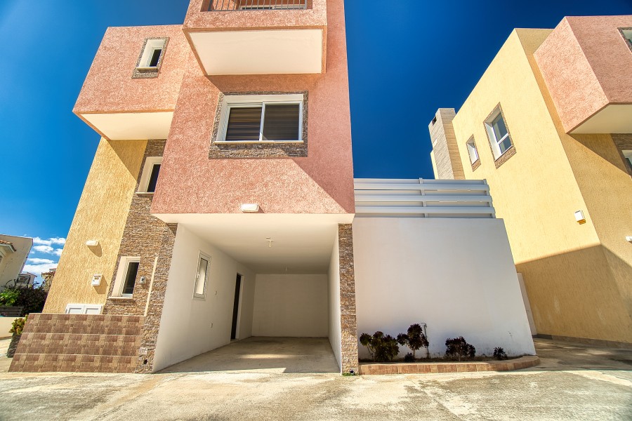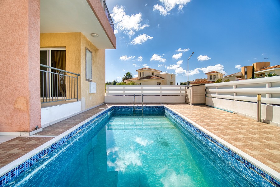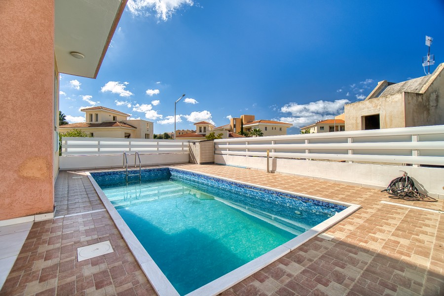 Great 3 bedroom brand new villa for sale in Chloraka walking distance from the sea. Property consist 3 double bedroom, covered parking and private swimming pool. The project is within walking distance to all amenities and services as well as the traditional square of the village were restaurants, pubs and taverns are located. The beach is only 4 minutes drive away from the villas. The project consists of four private villas with pools and parking. All four villas are build with high specifications, and the latest decorative materials on the market, offering a class of luxury and a high quality of living. The villas are designed in two levels. On the ground level, the entrance hall, living room, dinning room, kitchen, guest toilet and throw the stairs to the upper level where the master bedroom with en-suit bathroom along with another two double bedrooms shearing a master bathroom are located. From the bedrooms large patio doors lead to spacious covered verandas