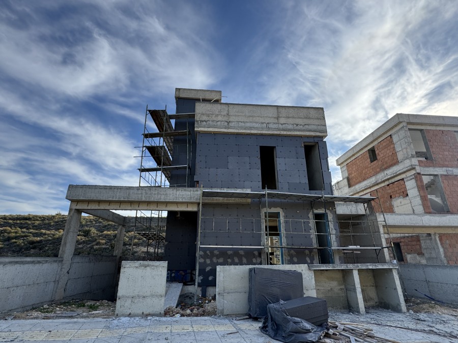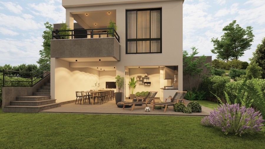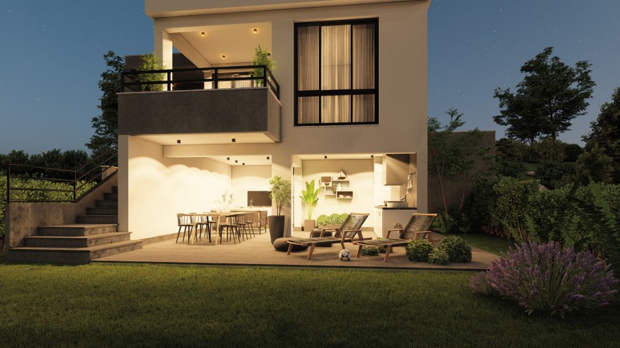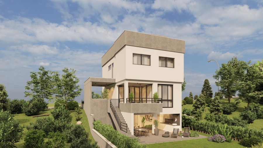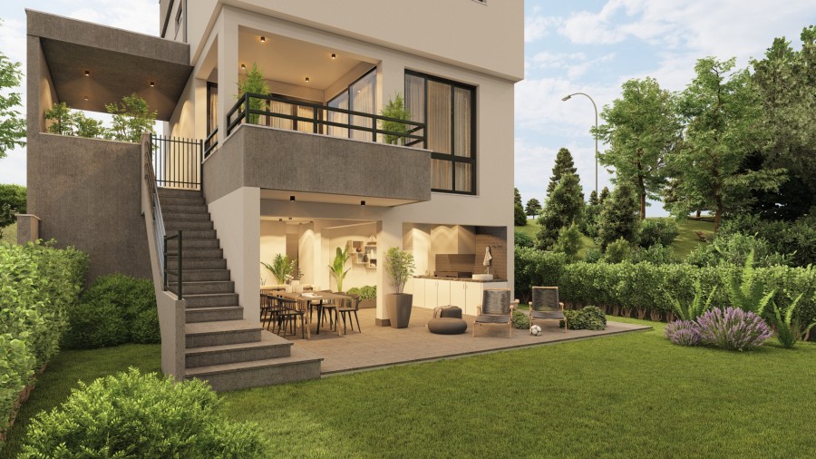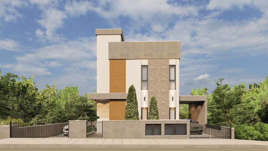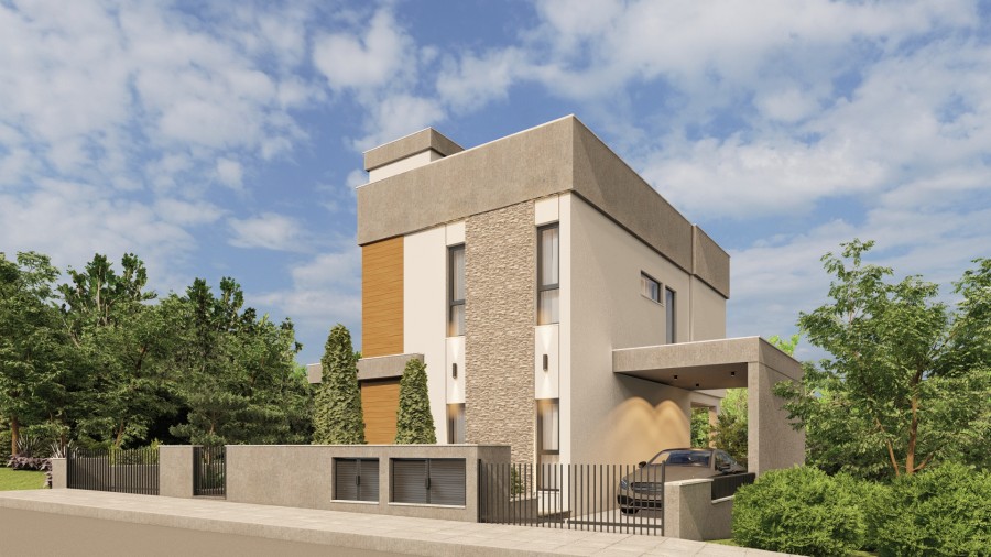 The villa spans few levels, including a semi-basement, ground floor, first floor, and a 30 m² roof terrace. The ground floor features an open-plan kitchen connected to the living and dining area, which leads to a covered veranda, perfect for relaxation or entertaining.
