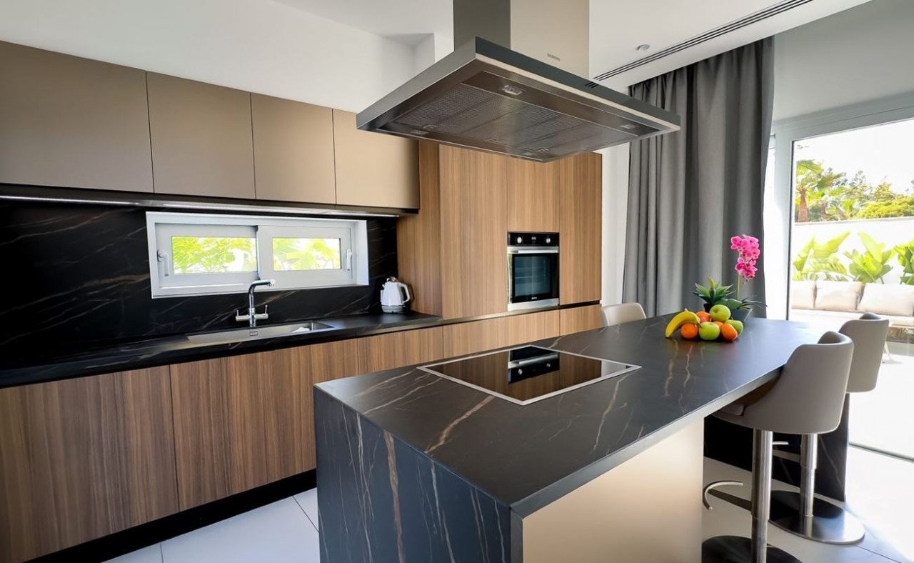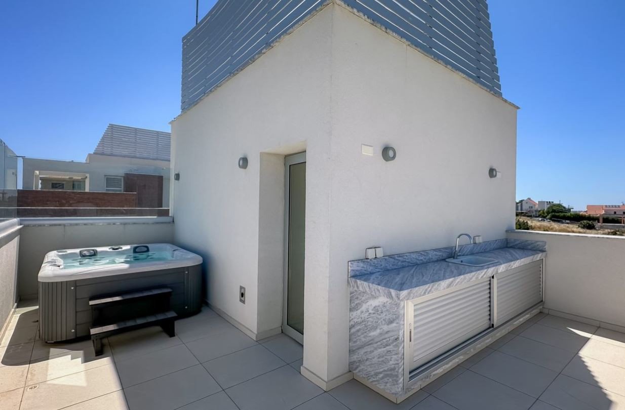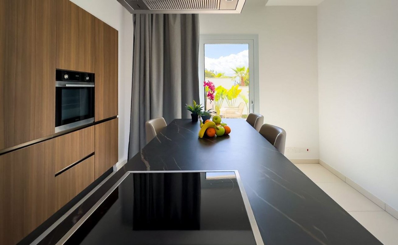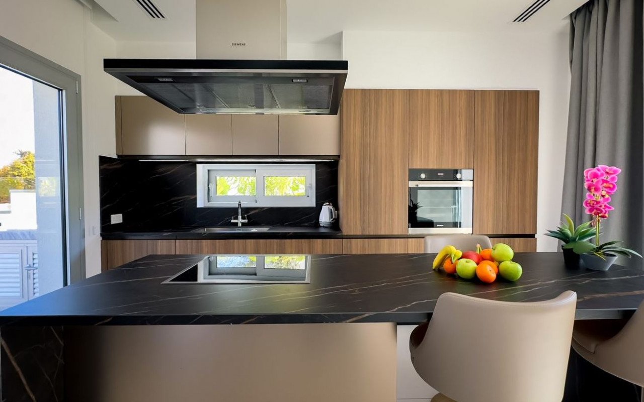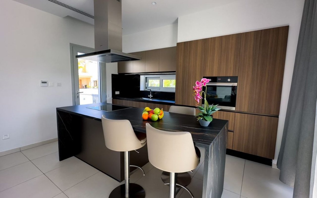 The ground level boasts an open-concept layout, seamlessly connecting the living space, kitchen, and dining area, providing an ideal setting for family gatherings and entertaining. A guest bathroom completes this level, ensuring convenience for residents and guests. For utmost privacy and serenity, the three bedrooms, each featuring an en suite bathroom, are located upstairs. Adding to the allure of this exceptional property is the roof garden, a true haven for relaxation and entertainment. Here, you can unwind in the jacuzzi while enjoying the stunning panoramic views of the city and the sea. One of the highlights of this villa is the immaculate 49.60 square meter private infinity pool.