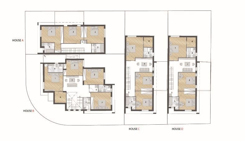 House C and House D as seen on the plans are consist of an open plan living room, dining area and an open plan fully fitted kitchen. House C has the option for a pool. On the first floor there are 3 comfortable bedrooms with the master bedroom en-suite. One covered parking space is available. Provision for air conditioning and Central Heating.