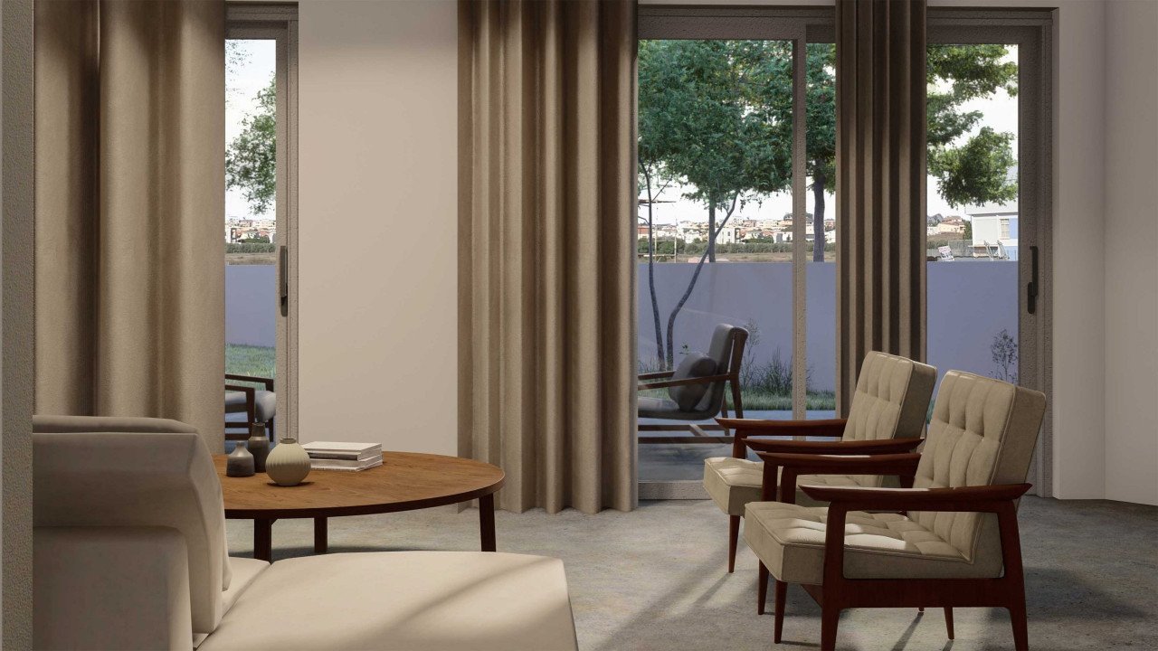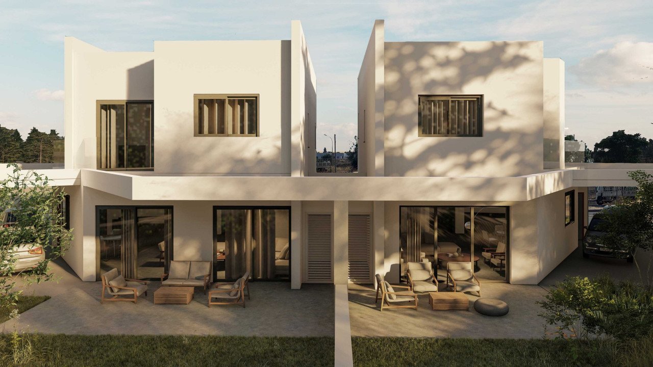 The ground floor is designed with spacious areas consisting of a large living room, a dining room, a sitting area, and a modern kitchen, all overlooking the covered veranda and the garden. It also features a guest toilet. Upstairs, there are three bedrooms: the master bedroom with a bathroom and two other bedrooms with a shared bathroom.