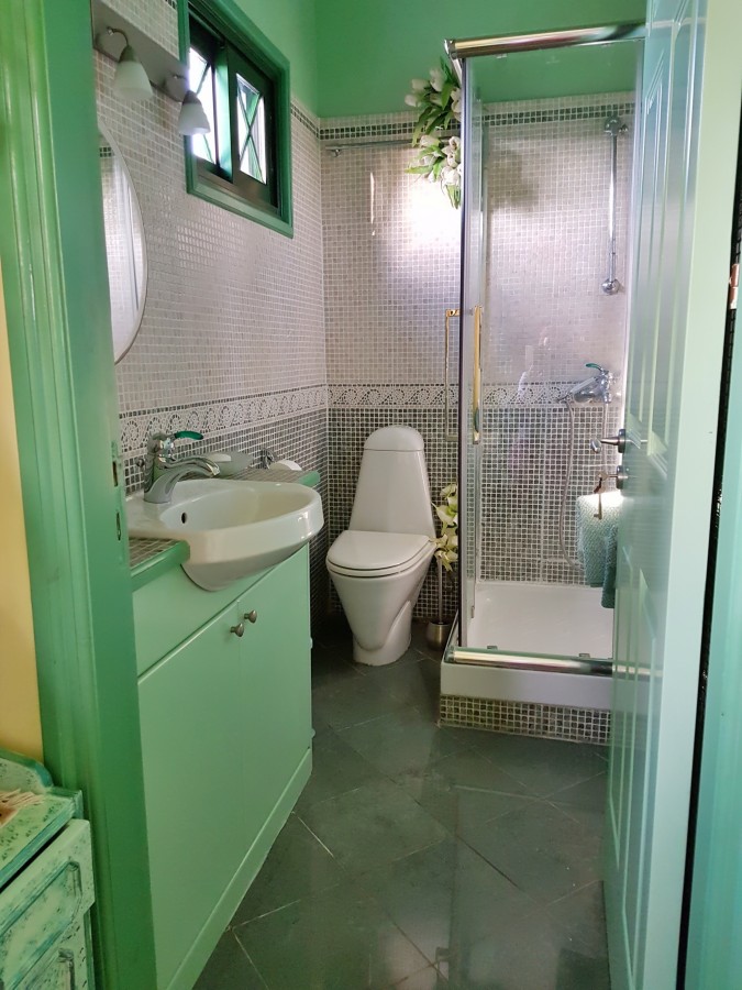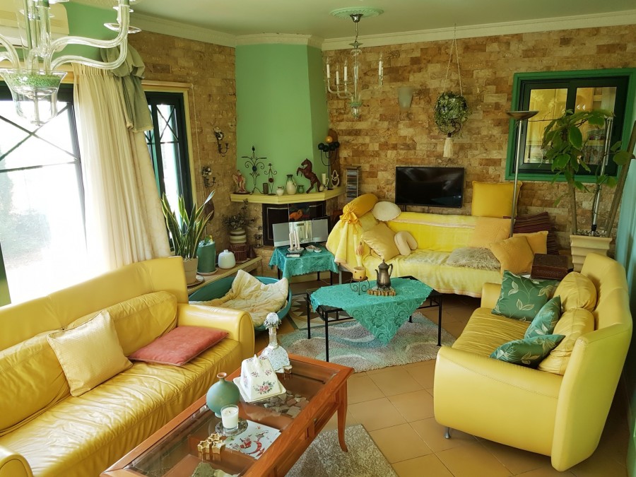 This exquisite villa, set on a beautifully landscaped 4000m² plot, offers complete privacy with two gated entrances and full enclosure. Surrounded by mature gardens, the property blends luxury with serene natural beauty. The villa features two fitted kitchens with Italian marble and river stone countertops, and walls. The main kitchen boasts a wooden ceiling, while the smaller kitchen includes a dog shower spa. All kitchen appliances are included in the sale. The living room offers panoramic views through six windows, complemented by an open fireplace and a stunning floor mosaic. A small bathroom with a shower, toilet, and sink is also located on this floor. Additionally, the ground floor includes a home office, a storage room, and a light-filled winter garden with beautiful views, thanks to four roof windows and two full-glass sides. On the first floor, the master bedroom is equipped with fitted wardrobes and an en-suite bathroom featuring a shower, bathtub, bidet, dual sinks, and cabinets. The second bedroom also has fitted wardrobes and a private bathroom with a shower, sink, and cabinets. The third bedroom features a walk-in wardrobe. Throughout the villa, all ceilings are finished with decorative plastering, and the floors are adorned with yellow and green Italian marble tiles. Double-glazed windows with mosquito nets allow plenty of natural light, and all rooms are equipped with air conditioning (7 units in total). The villa also features front and back verandas with marble flooring and ceramic roof tiles.