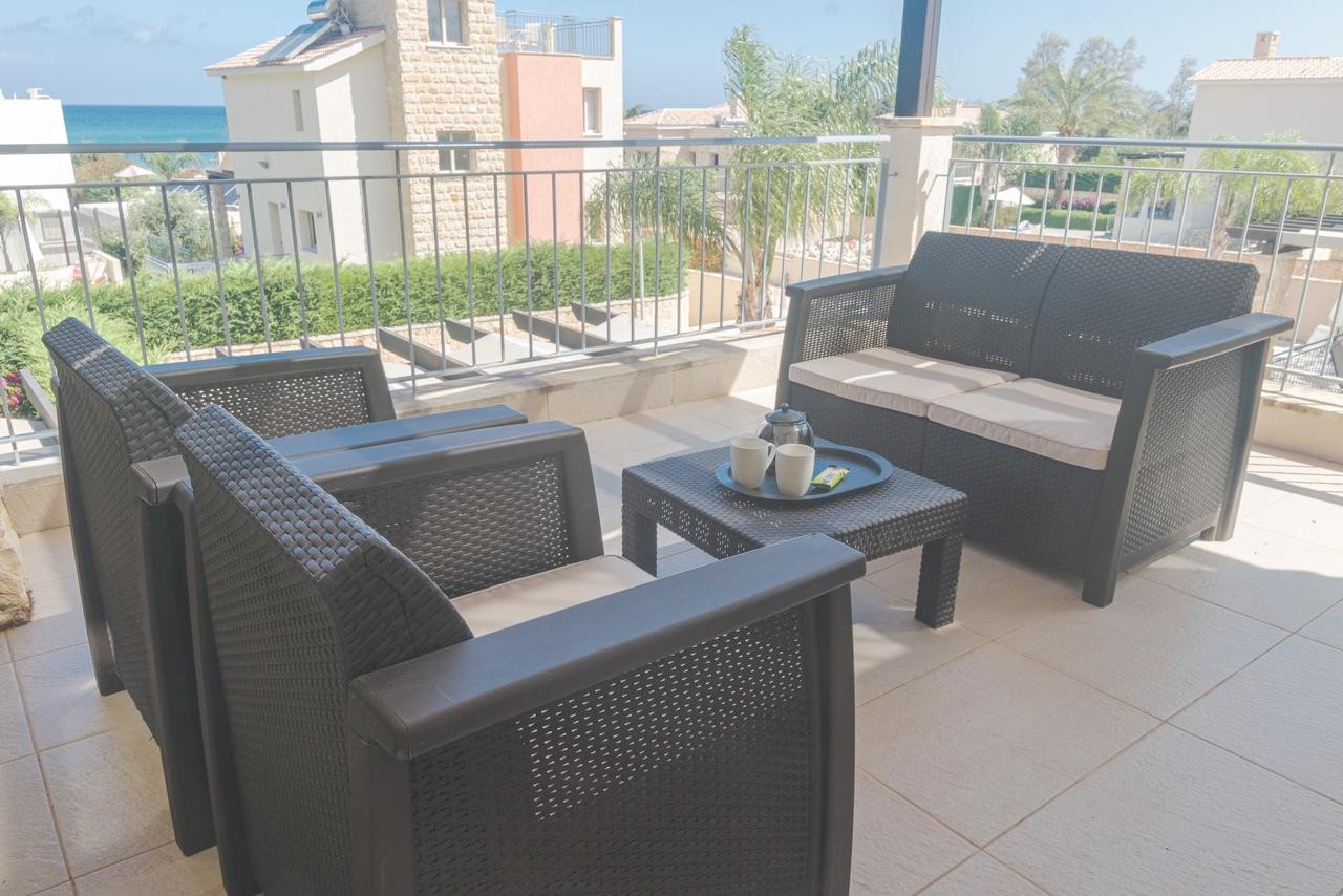The property is a part of a small luxurious complex featuring a generous living room , modern furnishing throughout and spilling directly onto a private, furnished terrace. The ultra modern kitchen, fully equipped with appliances, boasts elegant marble surfaces and is easily accessible both from indoors and outdoors.