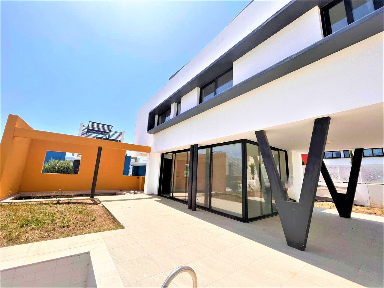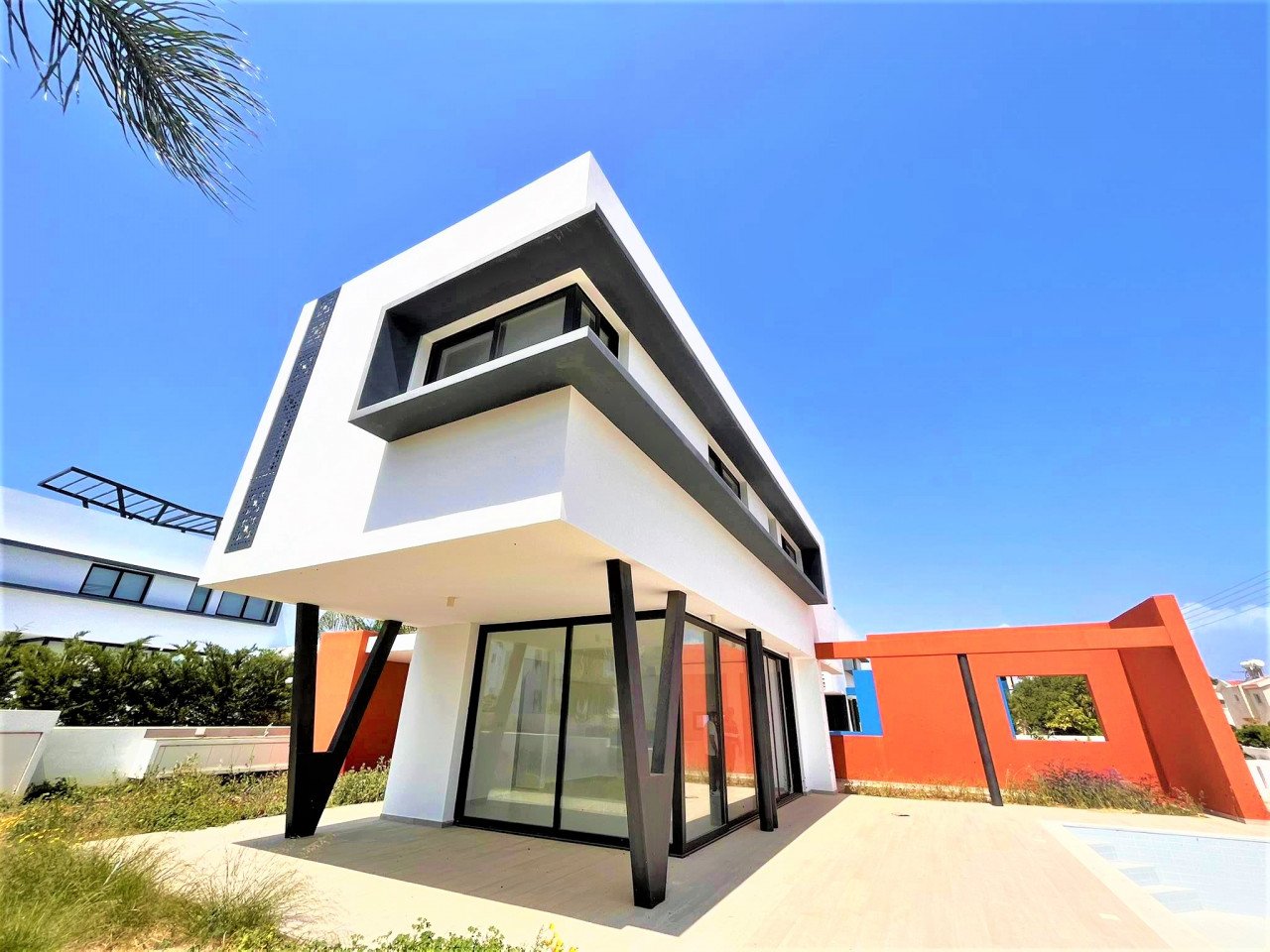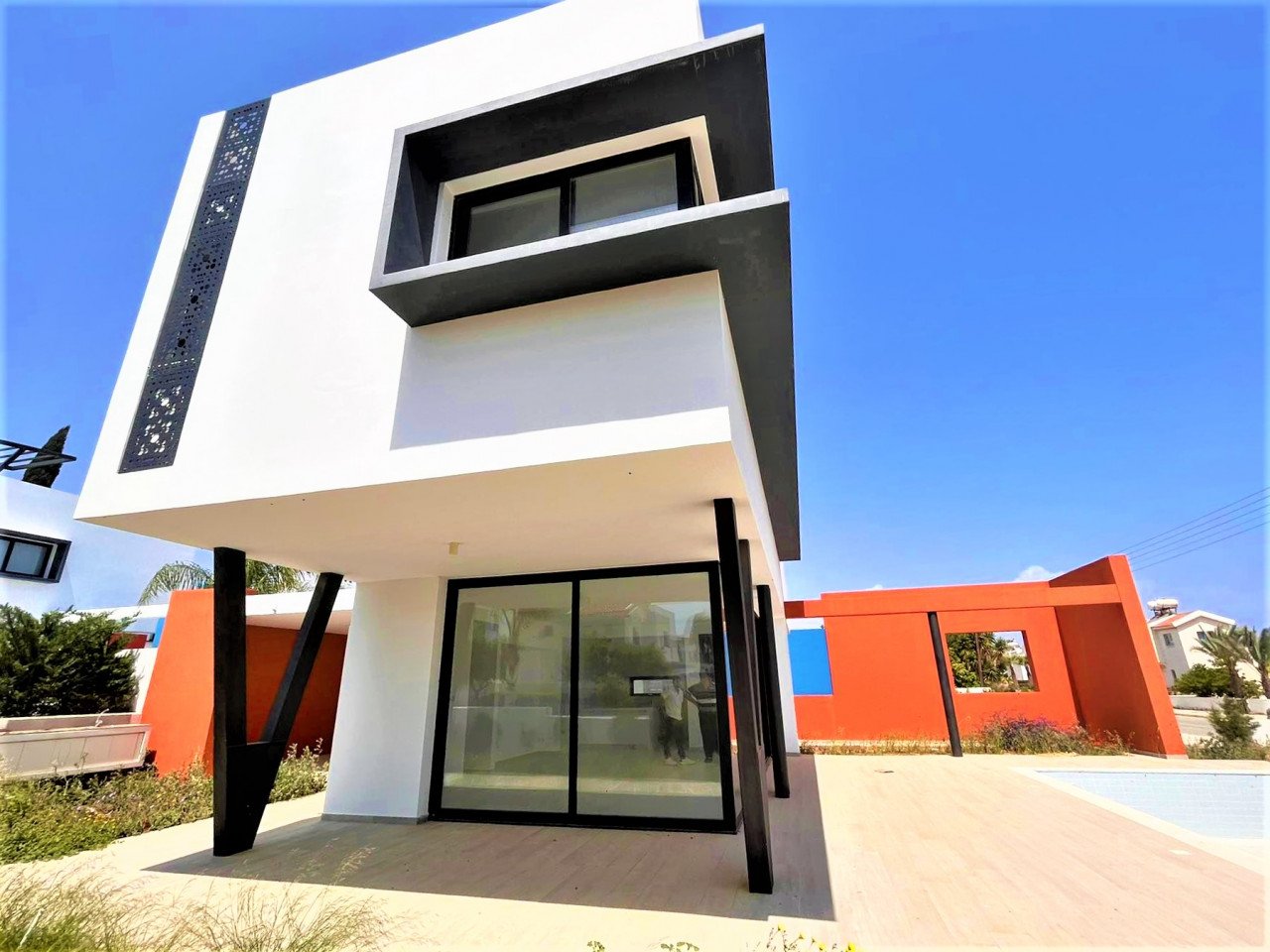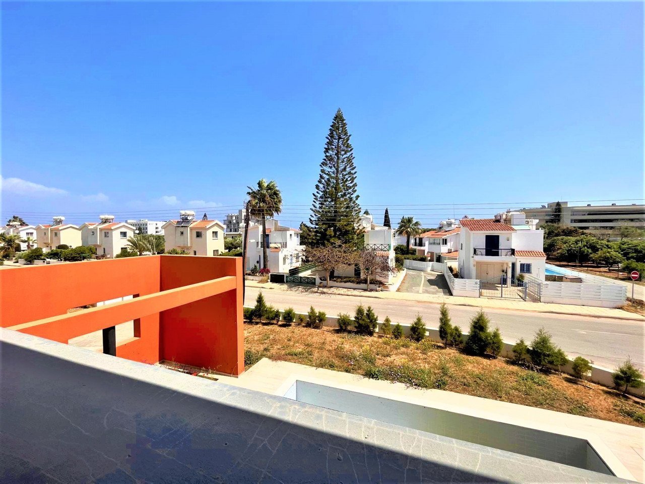 A unique 3 Bedroom Villa in Protaras tourist are. This amazing house, belongs to a colorful complex with incredible architectural design,and beautiful sea views. This villa has plenty of natural light coming throughout it because of the tall glazed windows/doors,a modern kitchen and an open plan living/dining area leading out to the swimming pool terrace. All 3 bedrooms are located on the first floor, they have built in wardrobes and en-suite facilities. The outside area has been created in a way that will make the outside living even more enjoyable. Large area, BBQ facilites, covered and uncovered verandas, surrounded by garden area.