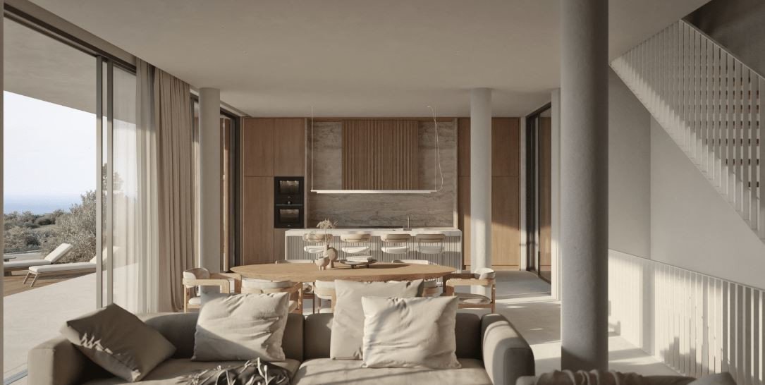 Exquisite three bedroom villas located in the popular and serene Sea Caves area, close enough to explore the stunning protected coastline surrounding's where you can enjoy the panoramic sea views. The natural materials blend harmoniously with the surroundings and there is synergy between modern and tradition. The contemporary interior has spacious living, dining and kitchen areas which all step out onto a veranda which offers plenty of seating and space for entertaining, including a wonderful barbecue area. Key Features VRV system Underfloor heating Swimming pool Sea view Barbecue area Floor to ceiling windows  Custom kitchen  Semi covered parking  Provision for electric curtain Camera/alarm Internal area 190 sq.m. Covered veranda 30 sq.m. Status: Under construction