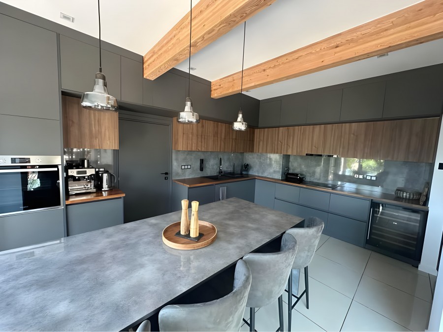 The villa boasts a private swimming pool, a cozy fireplace, and a dedicated barbecue area with an outdoor bar—ideal for gatherings and entertainment. Additional highlights include a drive-in garage with an attached workshop, comprehensive IT infrastructure with full Wi-Fi coverage, and a state-of-the-art audio streaming system. Each room is equipped with TVs, underfloor heating, and air conditioning, including the kitchen and living areas.