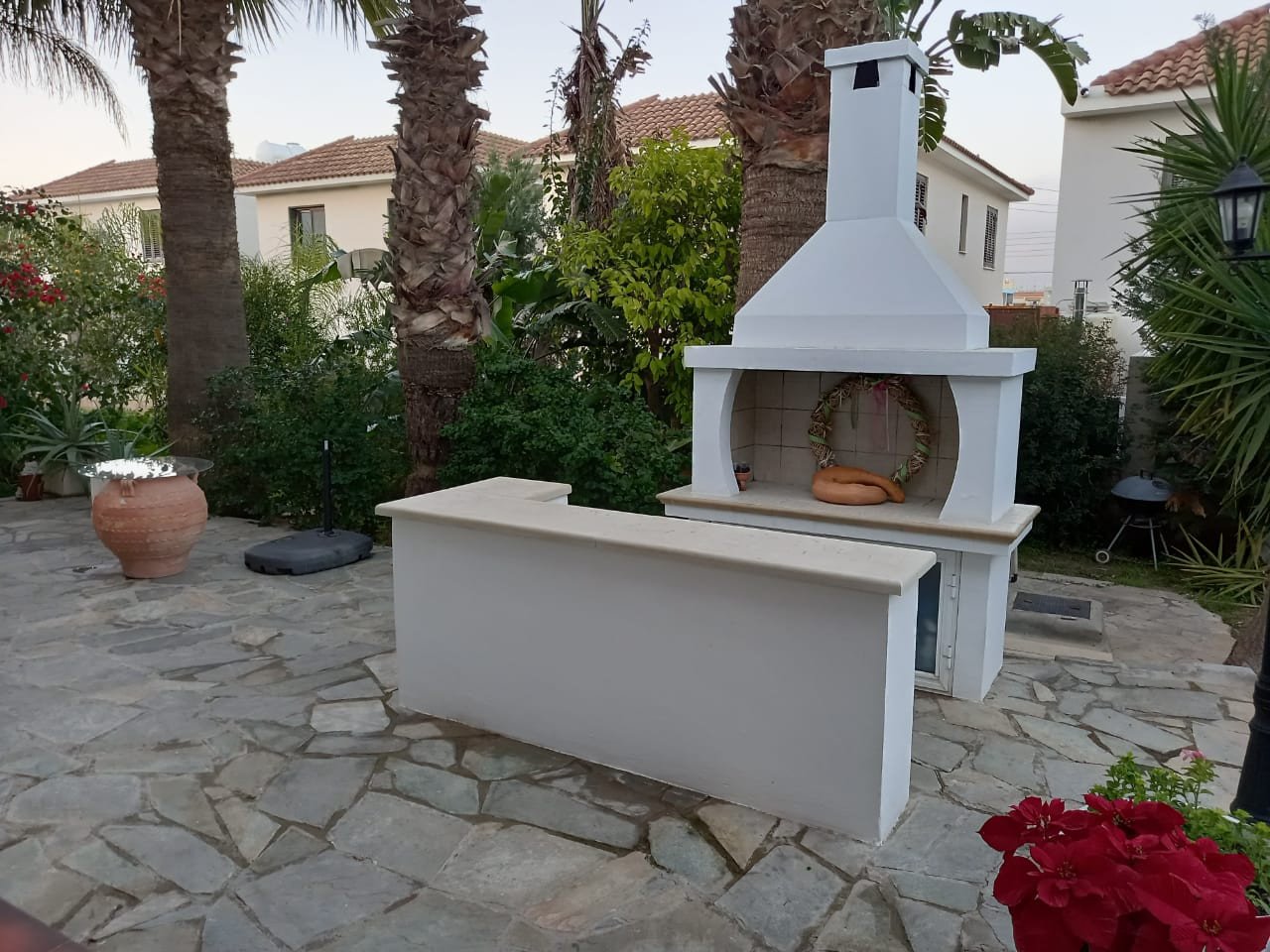 The mature garden offers a feel of a green oasis around the house and provides plenty of space for the children to play. In addition to a covered terrace, there is an outdoor BBQ station. Around the property, there is a high fence for privacy.