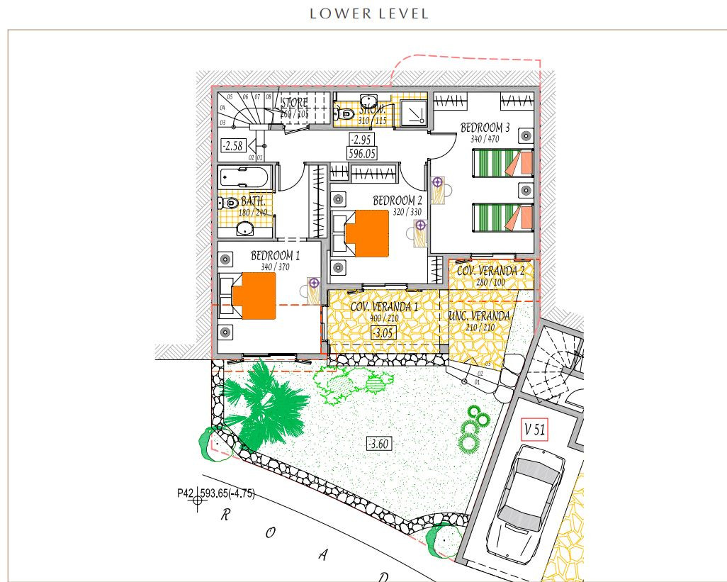 The lower level comprises three comfortable bedrooms. The master bedroom boasts an en-suite bathroom, while the other two bedrooms share a well-appointed family bathroom. All bedrooms have direct access to a veranda, providing a peaceful outdoor retreat.
