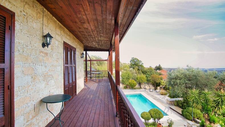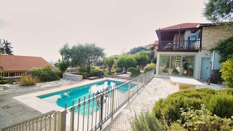 Stylish, traditional, and fully renovated 2 en-suite + office room which can be transformed to the 1 bedroom on the ground space villa for sale in Vouni village, Limassol. The house is set in mature gardens on a large plot only a short drive from Limassol. The house offers an open plan kitchen & living areas, 3 bedrooms, 3 bathrooms, study / 4th bedroom, cloakroom, wide balconies, pool & landscaped gardens. Ground floor: Large open plan living, Sitting, dining, and kitchen, study / 4th bedroom/maid's room. First floor: Master suite opening on the veranda with sweeping views to Limassol, Akrotiri the SW. Guest double bedroom w/en suite bathroom, built-in storage. Third double bedroom with built-in storage, family bathroom, and wrap-around L-shaped veranda.