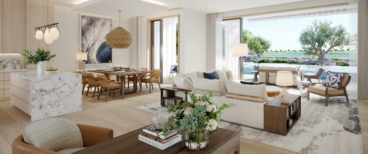 A large communal swimming pool and views towards a blue-flag beach, which is only a short stroll away, complement light-filled living rooms, spacious bedrooms and terraces.