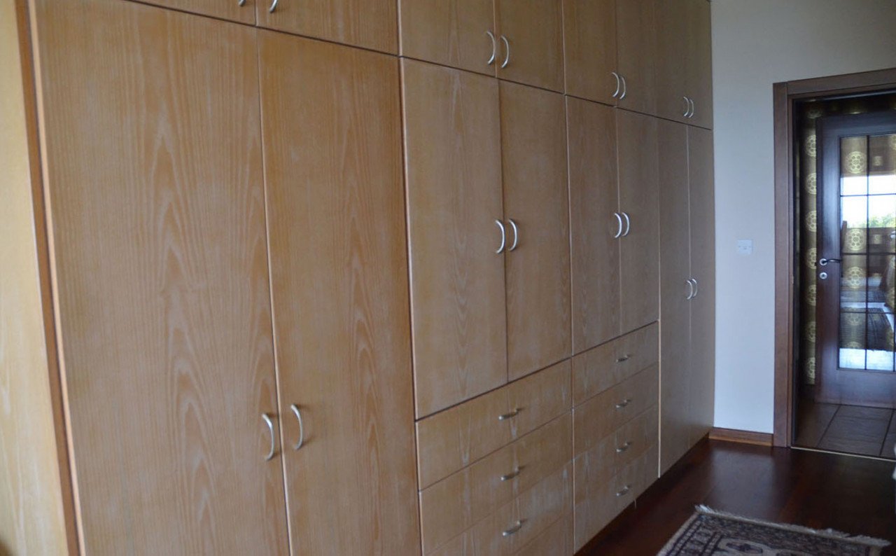 Solid wood entrance door, kitchen, and wardrobes
