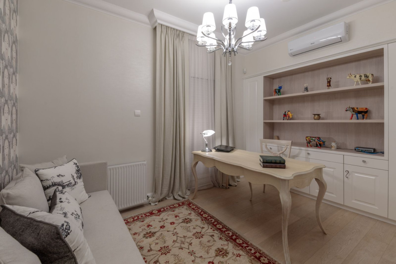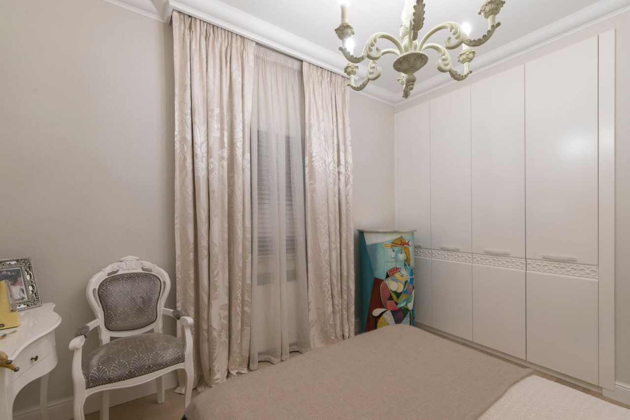The open-plan kitchen, dining, and living area is fully equipped, creating an inviting space for family gatherings. The large living room offers a perfect setting for relaxation. Two additional bedrooms come with built-in closets, while a fourth room can be used as a bedroom or office. The main bathroom includes dual sinks and a bathtub.