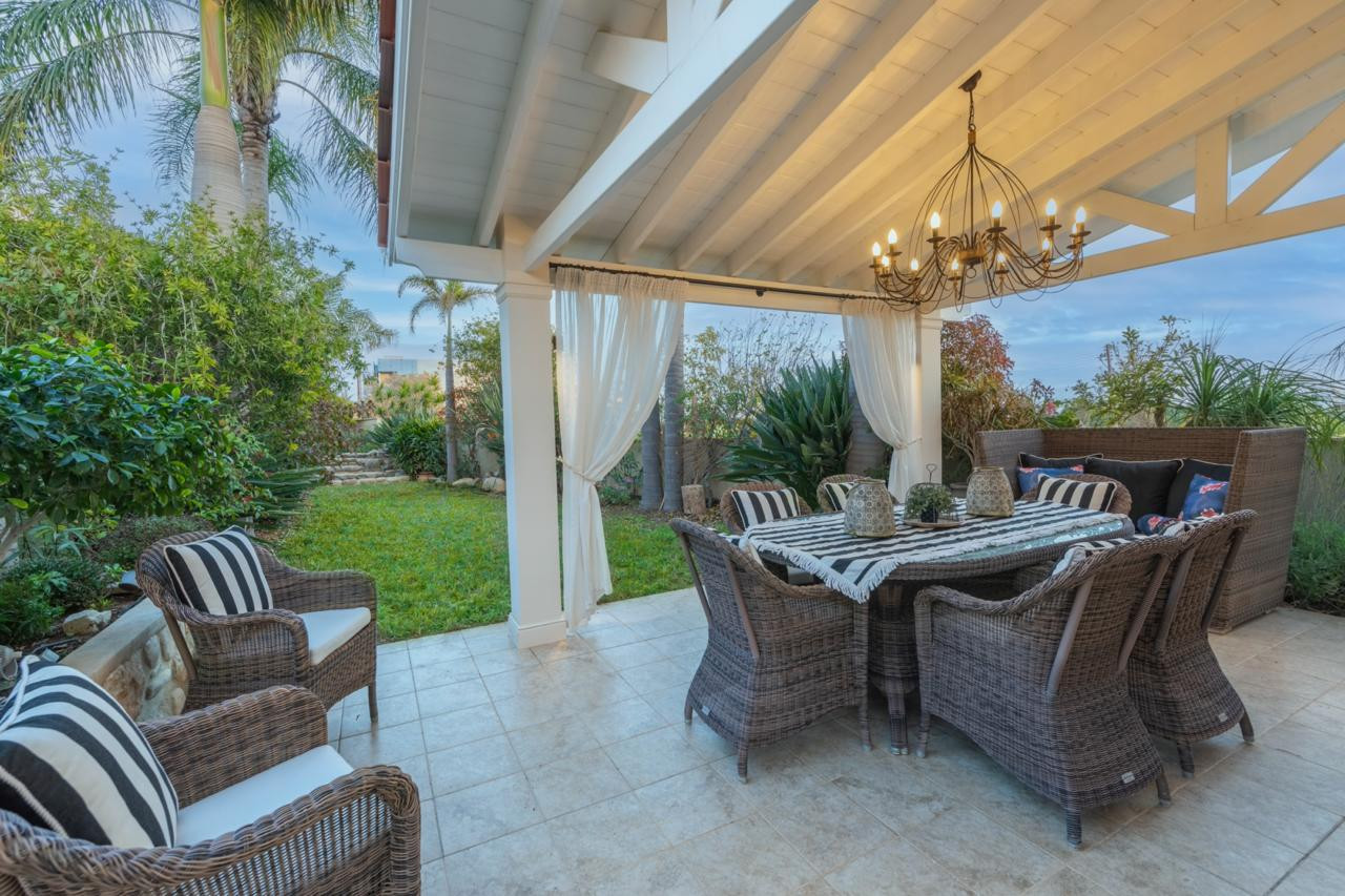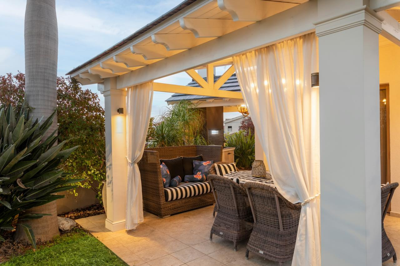 A covered veranda with a wooden pergola, motorized barbecue, sink, and storage, perfect for outdoor entertaining