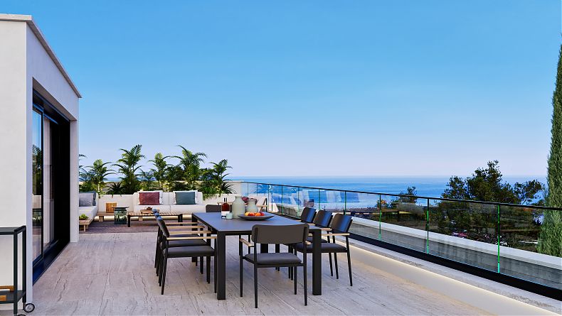 The upper floor consists of a large size bedroom and access to the roof garden where is the perfect place to enjoy the most spectacular mountain view and sea view.