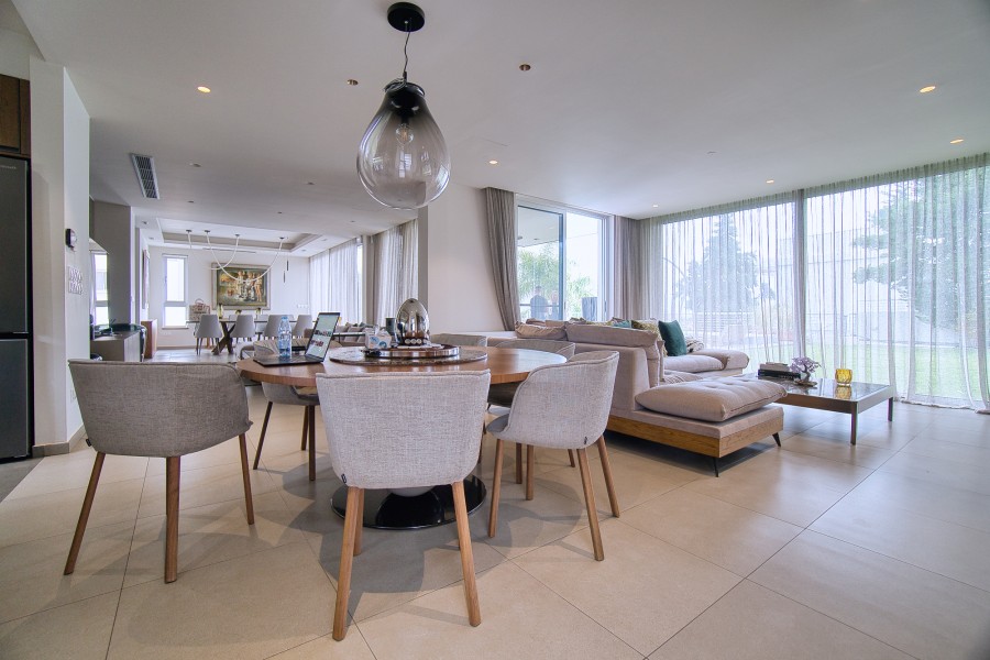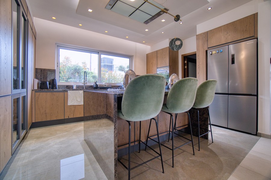 The villa's interior is adorned with stylish modern furniture, with the possibility for negotiation on its purchase, while kitchen appliances are included, enhancing the convenience of the sophisticated lifestyle offered by this remarkable residence. This very stylish house with a big swimming pool presents the epitome of luxury living in Limassol's esteemed neighborhood of Agios Athanasios.