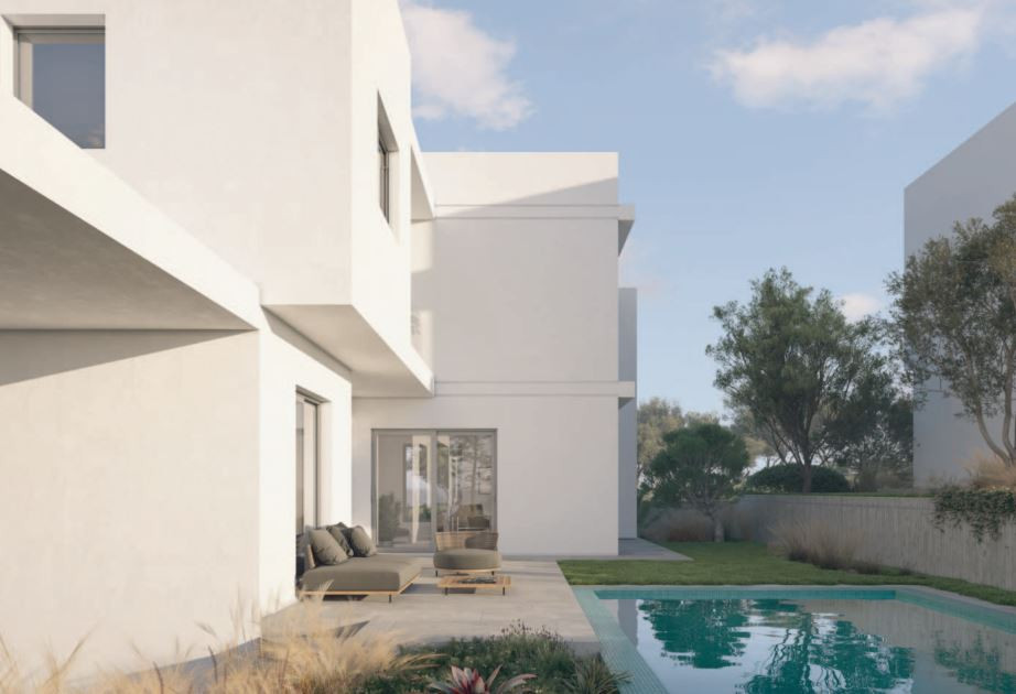 A contemporary-designed villa with a beautiful garden, a double-covered garage, large terraces, and an optional pool.
