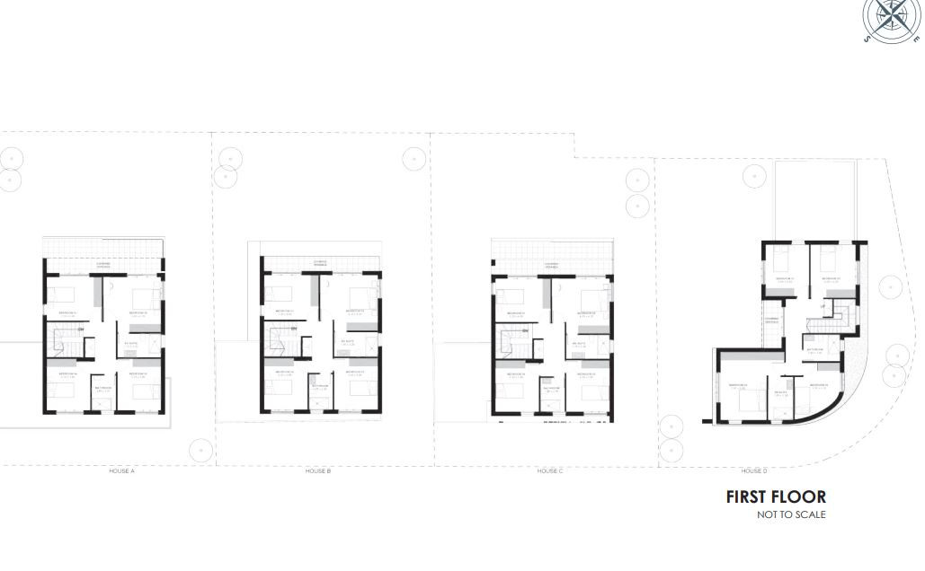 On the ground floor, it features a spacious open-plan living room, dining room, a family sitting area, a modern kitchen, a laundry room, and an office room, all with a view of the garden. It also includes a guest WC. On the first floor, you'll find four bedrooms: the master bedroom with a walk-in wardrobe and an en-suite bathroom, along with three additional bedrooms, each with a wardrobe area and an en-suite bathroom.