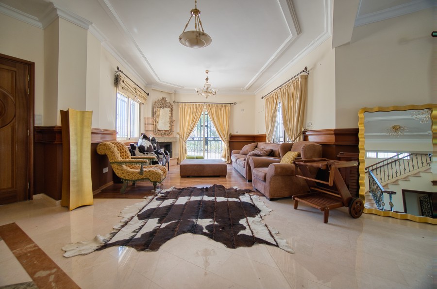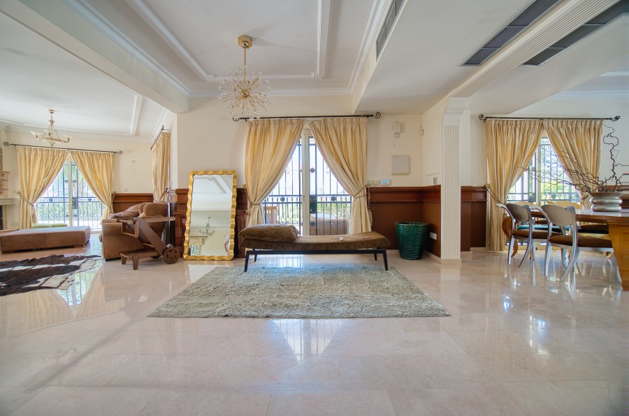 A luxury detached villa of a total of 6 bedrooms which 4 on the first floor and 2 in the basement in the prestigious area of Agios Tychonas, Limassol. It is a 2 minute drive from the beach and Four Seasons Hotel with sea and mountain views. The villa consists of 3 floors. The ground floor is a spacious area of 3 living rooms, chimney area, dining area and big kitchen made of high quality natural wood plus a guest wc. There is also doors leading to the outdoor terrace, garden, swimming pool, barbecue area and outdoor shower. The first floor consists of a master bedroom with en suite, 4 spacious bedrooms, family bathroom and balconies with sea view. The basement levels consists of a small kitchen, 2 bedrooms, big living room, bathroom with a sauna and private shower. There are 2 covered parking area and a big uncovered area for more cars. Big garden with mature trees and irrigation system. Solar panel, full diesel central heating, A/C on ground floor.