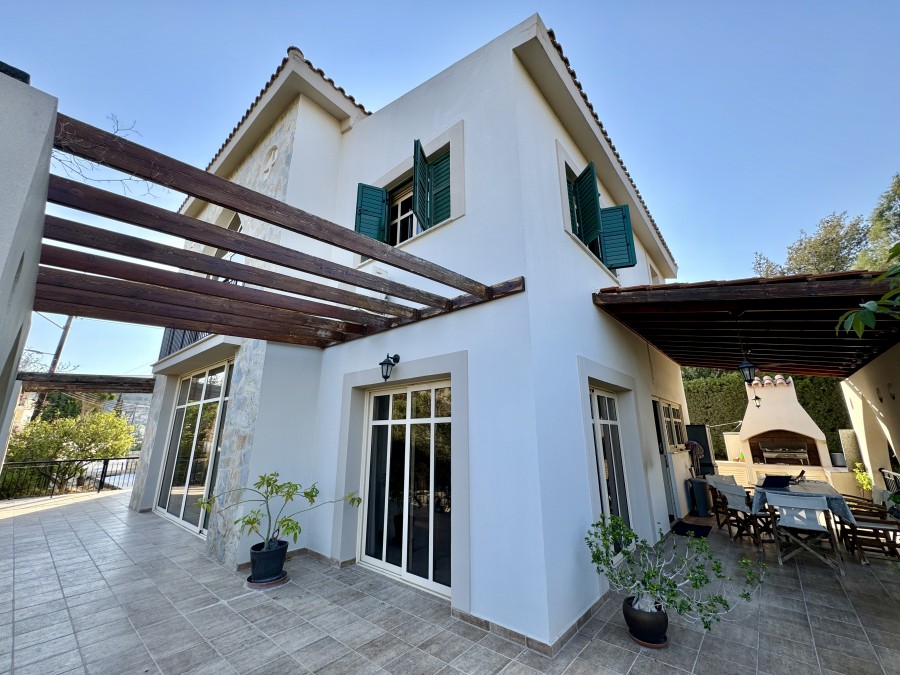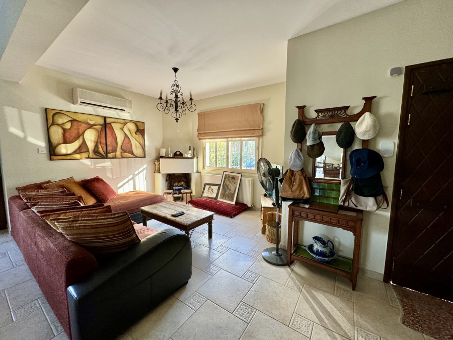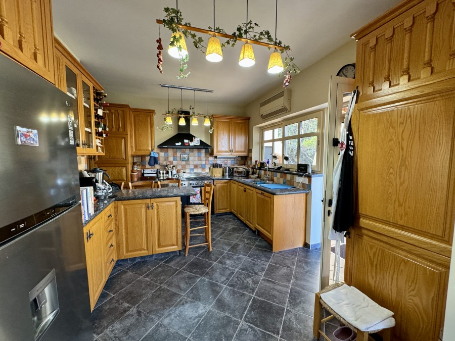 This charming Mediterranean-style property, located in the desirable area of Ag. Tychonas, offers a unique blend of elegance and comfort. Built on two levels, the house boasts a spacious open-plan living and sitting room with a cozy fireplace, perfect for family gatherings. The separate kitchen and dining area lead out to a large patio, BBQ area, and mature gardens, ideal for outdoor entertaining. The ground floor also includes a study/guest room with an ensuite bathroom and a convenient laundry room. Ascend the wooden stairwell to the first floor, which comprises three double bedrooms with fitted wardrobes and a family bathroom. The master bedroom features ensuite facilities, ensuring privacy and luxury. From the upper floor, enjoy stunning views of Ag. Tychonas village and the sea, offering a serene and picturesque backdrop.