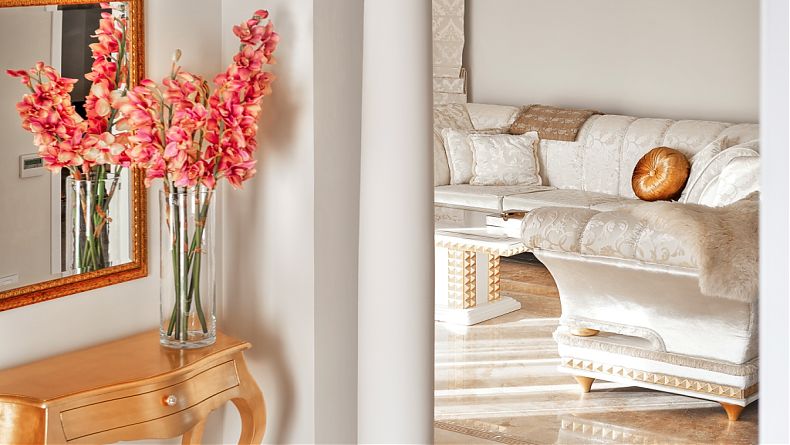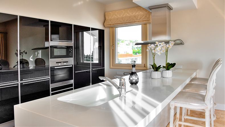 Neoclassical villa is performed in a neutral beige tone. Used on the floors Italian marble travertine, mosaic insert firm Versace, Italian kitchen with glass surfaces, cast top in the bio-material Corean DuPont, plumbing company Villeroy & Boch.