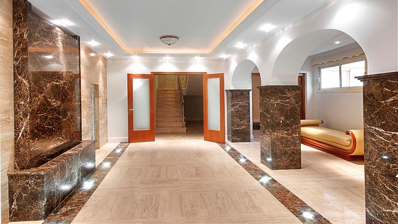 The ground floor has a grand entrance into the house with light on the floor, with columns, marble imperador rich chocolate color. Villa has a built-in floor pool with Jacuzzi.