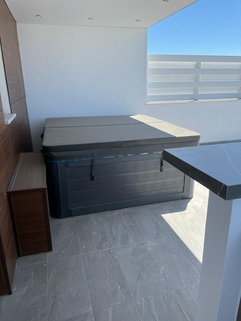 One of the highlights of this exceptional property is its magnificent roof garden featuring a luxurious jacuzzi, perfect for unwinding while taking in the stunning vistas of the azure sea and beyond.