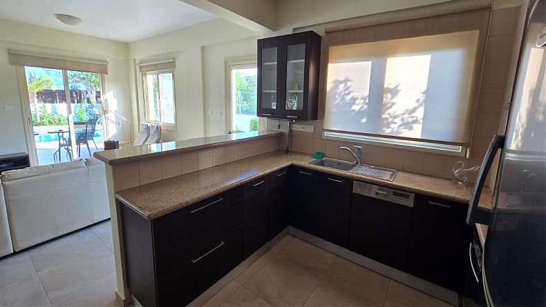 • Spacious open plan lounge/dining room and kitchen, very bright with patio doors leading to pool and garden. The kitchen is fully equipped with electric oven and hob, fridge freezer and dishwasher