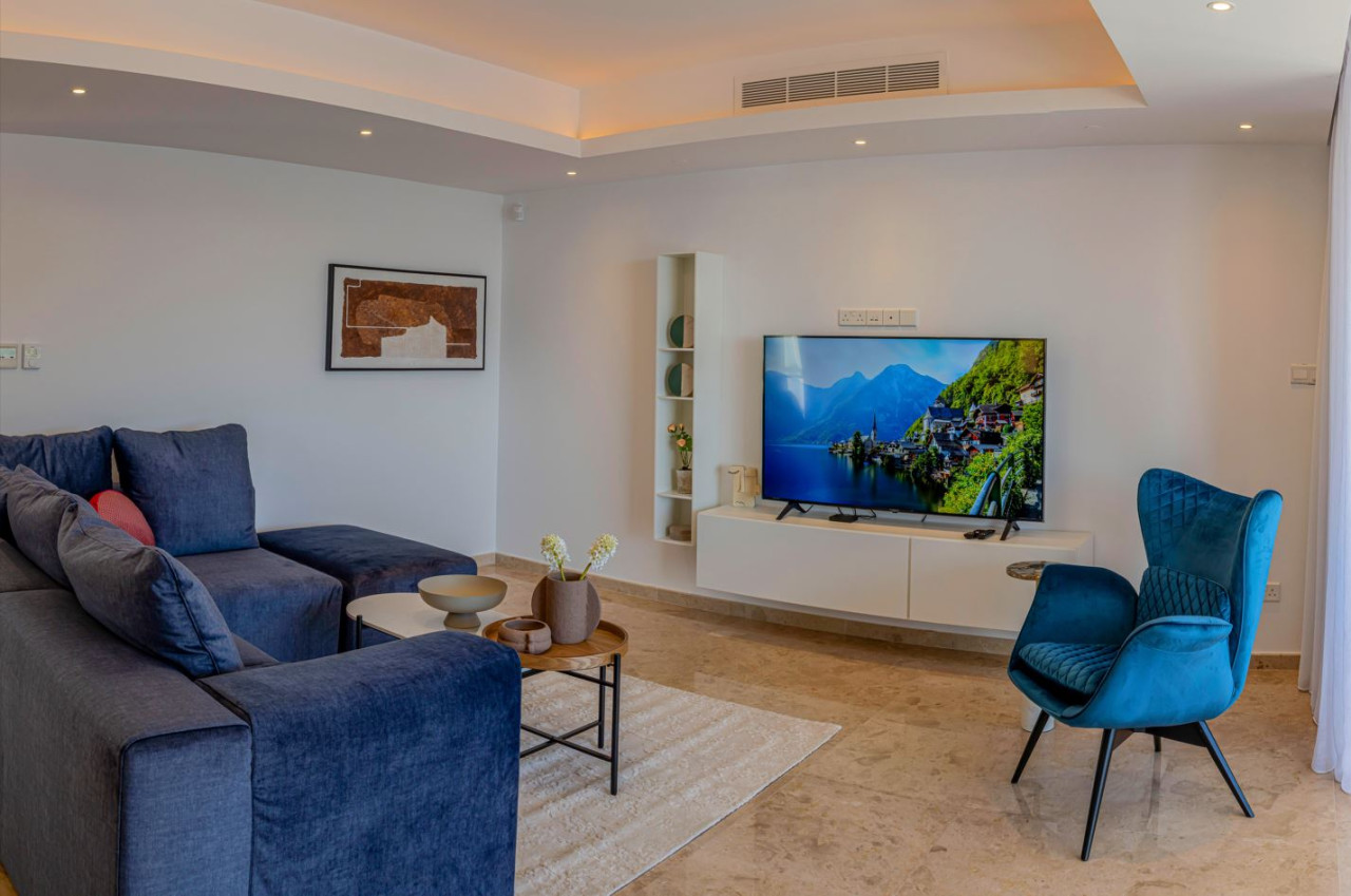 Beyond this is a generously-sized sitting room with panoramic glass doors opening out on to the veranda with captivating sea views and beautifully landscaped gardens with large terraces.
