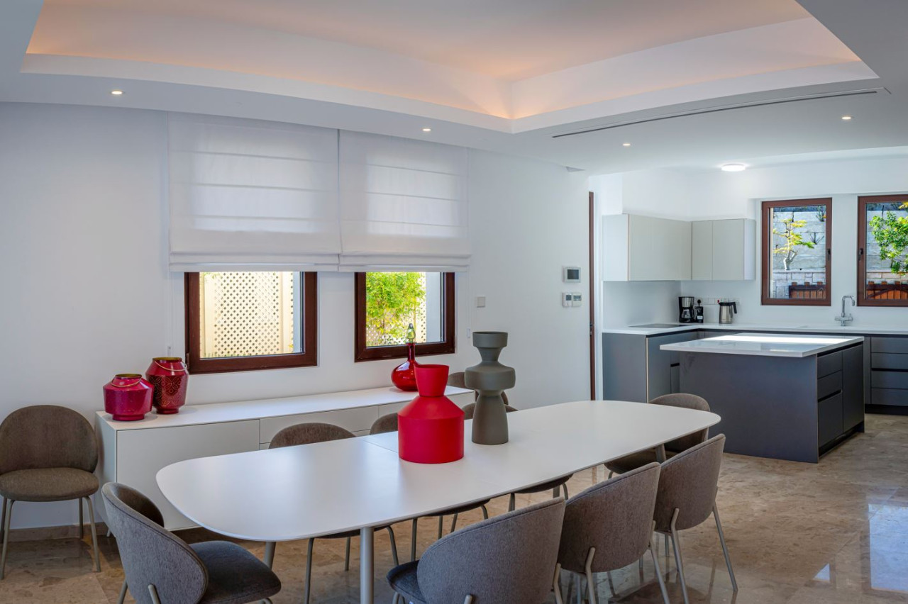 A few steps to the left, the large dining room has its own covered veranda and an open-plan kitchen, fully equipped with luxury appliances.