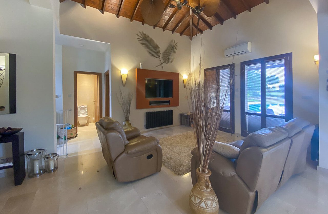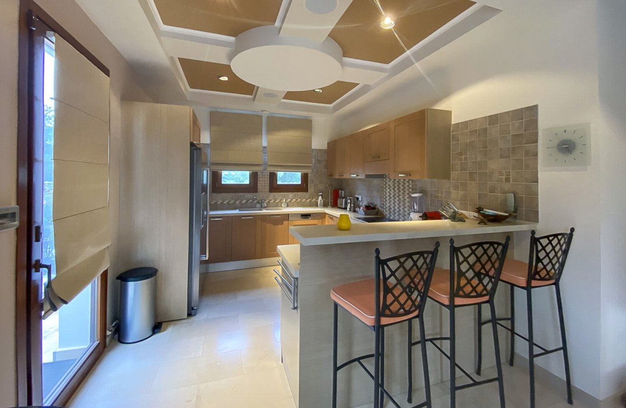 The villa is harmonious in color and this is noticed when entering through the main entrance. Open plan spacious living is on offer with the lounge, dining and kitchen all blending into one. The villa enjoys tremendous light through its full-length doors. The kitchen is fitted with modern appliances, granite worktops and luxury fixtures and fittings. Very high ceilings can be noticed in the lounge area giving the villa a sense of space all around. The villa has been tastefully decorated with modern furnishings and accessories throughout.