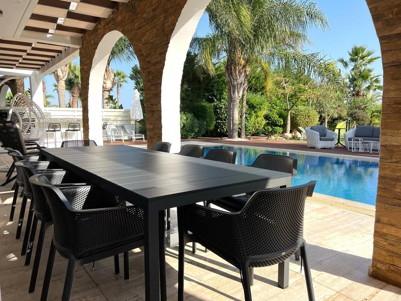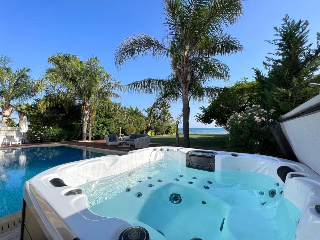 This amazing private beachfront villa is located in Agia Napa (Ayia Thekla area), offering all facilities, such as a swimming pool, private garden, outdoor facilities, jacuzzi, kids play area, and mostly the front beach facilities. The house was recently renovated using a modern design and high-finishing materials. The prices include all furniture fitting, kitchen electrical appliances, AC units, etc, all in very good condition (almost brand new)