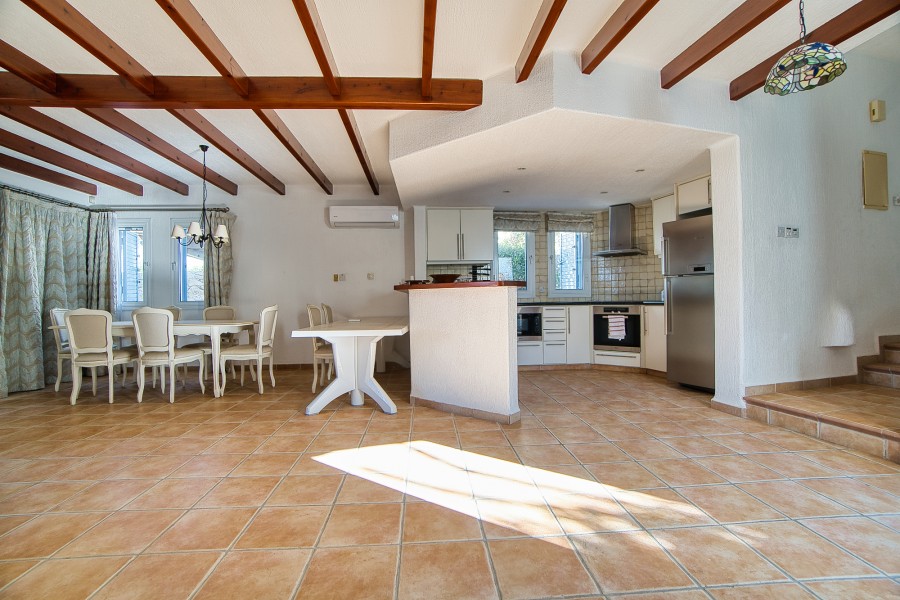 Fantastic 1st Line to the sea, 4 bedroom detached Villa with three bathrooms located in an award winning development Apollo Beach Villas in lower Chloraka. Well maintained complex , beautiful path walks, walking distance to the sea and easy 5 minute drive to the town center or the harbour, which has all amenities, bar, restaurants and shops The property has uncovered parking and front door at the street level. Open plan living dining and kitchen areas , also fire place & access to covered patio. 3 double bedroom, family bathroom and ensuite shower in master bedroom. Internal stairs leading down to 4th bedroom , laundry room , bathroom & extra spacious room. Features: underfloor heating, fireplace, air conditioning, shutters throughout, fly screens, double glazing, granite worktops, white goods. The villa is fully furnished and has full title deeds. Private Swimming Pool , private landscape garden & BBQ for complete perfection.