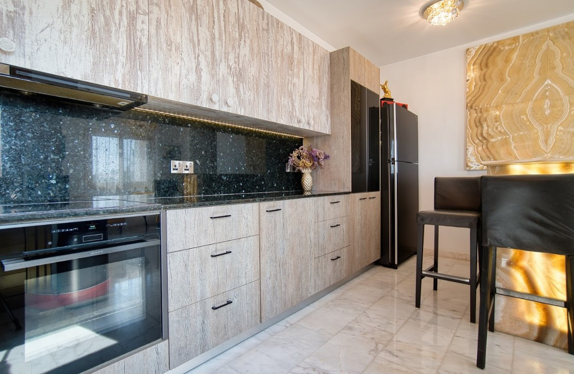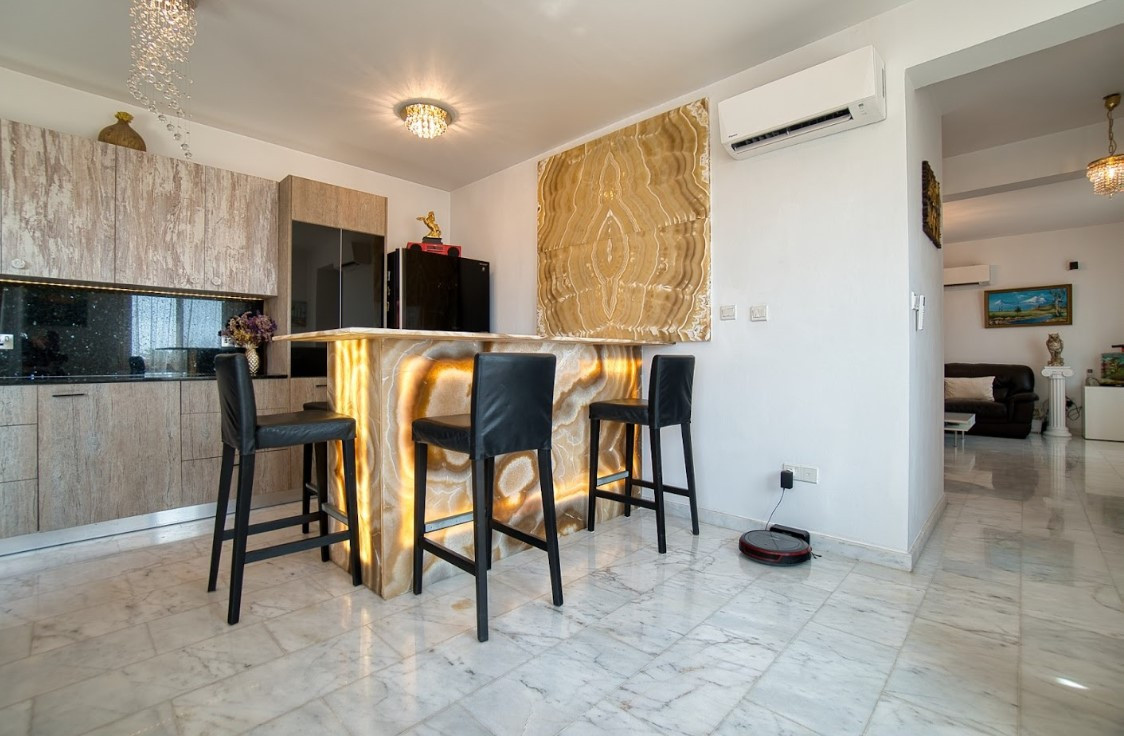 The house has three floors. The layout of the first floor consists of a living room/recreation areas, open-plan kitchens with a beautifully decorated bar counter decorated with an illuminated onyx composition.