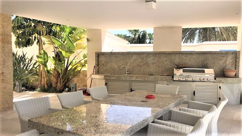 On the covered glazed terrace there is a summer kitchen-dining room overlooking the sea, the gardens and pool.