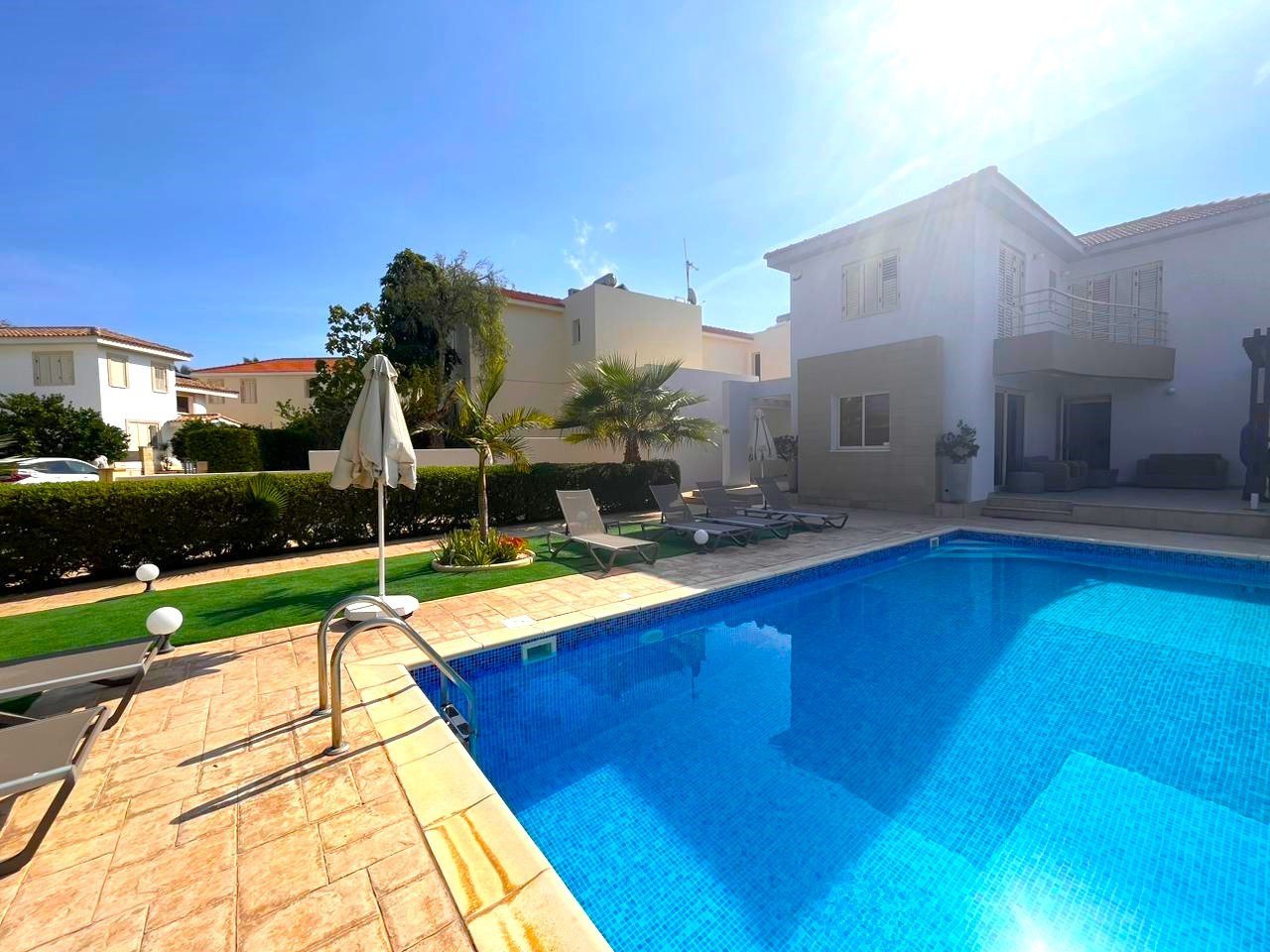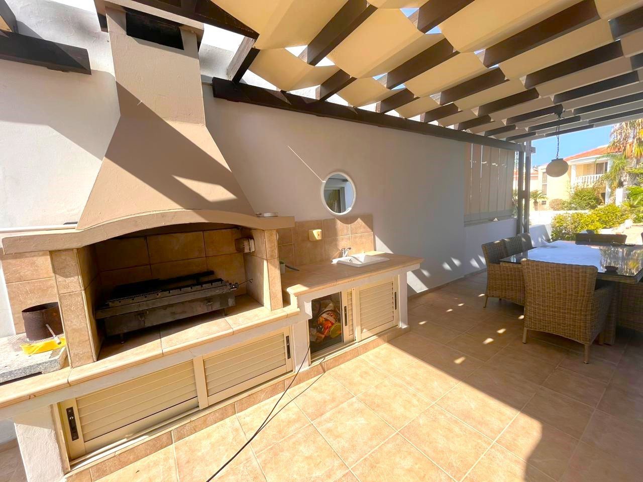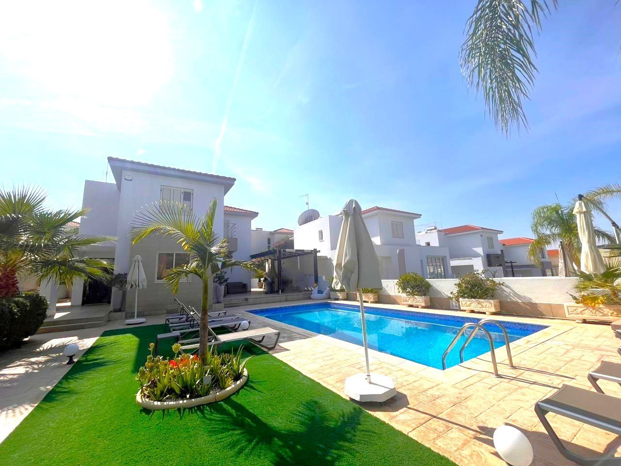 Set on a 500 square meter plot, the residence boasts a total covered area of 169 square meters, providing ample space for comfortable living. Two of the bedrooms feature en-suite facilities, offering a touch of luxury and privacy, while a common bathroom caters to the remaining occupants. The villa is impeccably furnished, complete with air conditioning for a comfortable retreat from the coastal sun, and it has been meticulously maintained, ensuring a seamless living experience. Surrounding the property are lush, mature gardens, creating a tranquil oasis, and a sprawling pool beckons for refreshing dips on warm summer days.