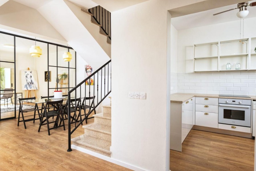 This semi-detached villa offers a spacious 155-square-meter interior on a 245-square-meter plot. With four rooms—three bedrooms and an additional 12-square-meter office that can easily be converted into a fourth bedroom—the property provides flexibility to suit your needs. The villa includes three bathrooms: a main bathroom with a bathtub, another with a shower, and a convenient guest toilet. Private parking accommodates up to two cars, and the backyard features low-maintenance synthetic grass, creating a comfortable outdoor area. The property comes with a clean title deed, and the asking price is 410,000 euros.