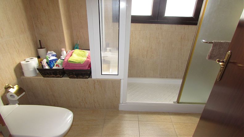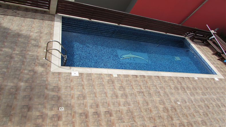 The entrance to the property is at the street level ground floor, which comprises an open plan living / dining / kitchen area with fireplace, additional kitchenette / laundry room and guest WC. Up the marble staircase, on the 1st floor, are 3 bedrooms, family shower, kitchenette in the hallway, and in the master bedroom, an en suite bathroom with corner bathtub / Jacuzzi and a walk-in wardrobe. The lower floor comprises 1 bedroom with shower / WC and open plan kitchen / dining room which opens onto a large covered veranda / outside eating area with BBQ and utility room. At this level is the pool and garden with various trees.