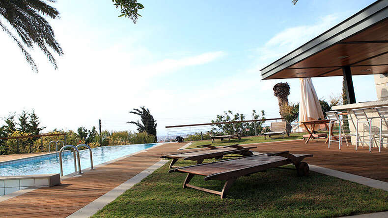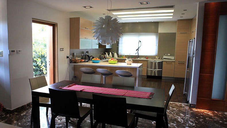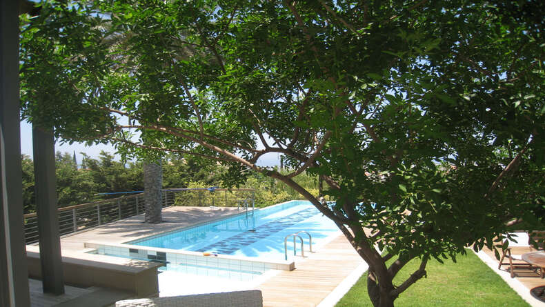 Title Deeds are available. This very spacious, modern, detached villa is situated in an outstanding location with stunning sea views in Konia. It is set on a large 1200 m2 plot with mature garden, double garage, a 15 x 4.6 m pool with pool bar / BBQ area, wooden pool deck and an outside shower/WC.