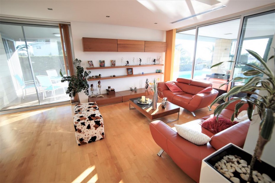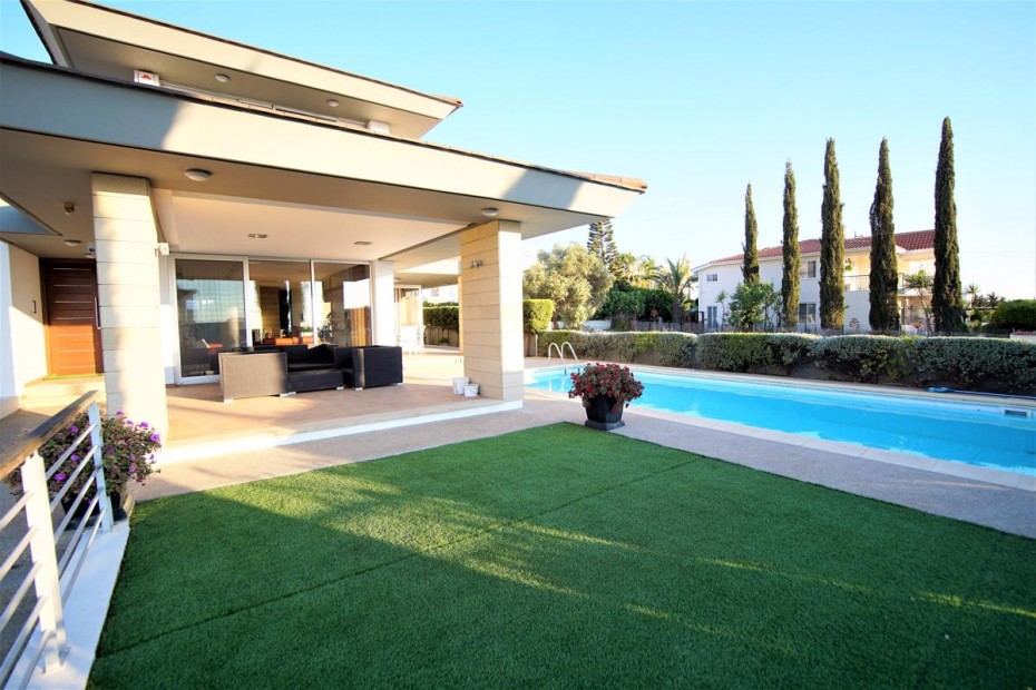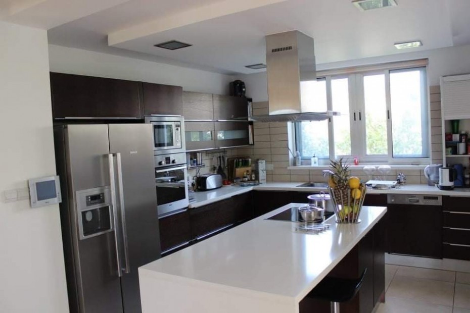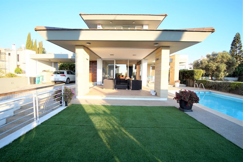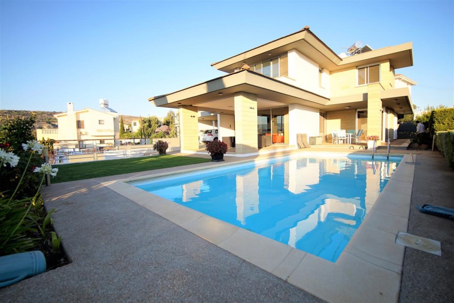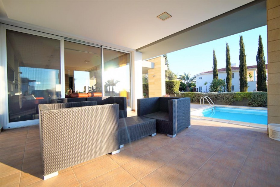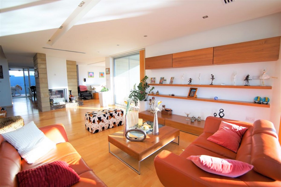 This moderns and luxurious villa is located at an attractive area in Konia,with panoramic views over Paphos city and the sea. The villa is within minutes’ drive to the center of the town and the beach, yet in peaceful surroundings of a village in cul-de-sac, has everything one would need for a stylish lifestyle. Every detail was carefully selected and quality crafted. Highlights include double external walls and double glazing doors sliding into the walls. A centered double face fire place, Parke floorings, troweled plaster walls and false ceilings, hidden lighting, a climate-control system (VRV), high-tech security system, double wall structure (energy saving) and spacious corner rooms that overlook the city and the sea are only a few of the features. The floor plans encompass four spacious bedrooms, 3 bathrooms, and a sleek and stylish gourmet kitchen that flows through to the dining room. The expansive living room opens up to a spacious front covered patio with pool and grass area. The master bedroom, complete with walk-in closet and en-suite, ensures parents have a private space where they can enjoy panoramic views on their private balcony.