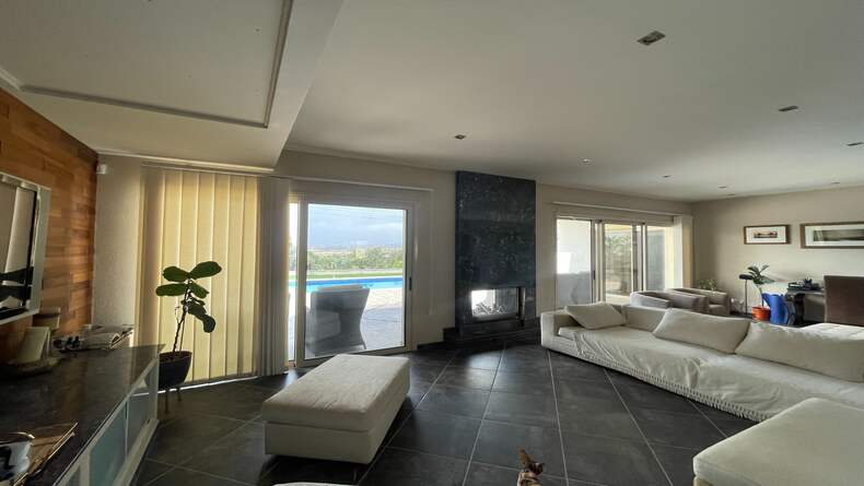 Inside it comprises a spacious living / dining room with a gas fireplace, guest WC and large sliding doors opening onto a covered veranda overlooking the pool. The large, modern and fully equiped kitchen includes a breakfast bar / cooking island with granite worktops and electrical appliances of well-known brands. 4 spacious bedrooms with fitted wardrobes, 2 en suite showers and a family bathroom complete the property.
