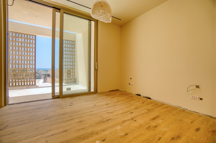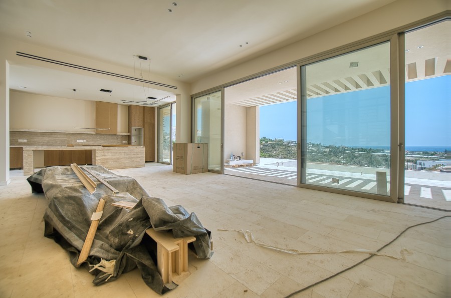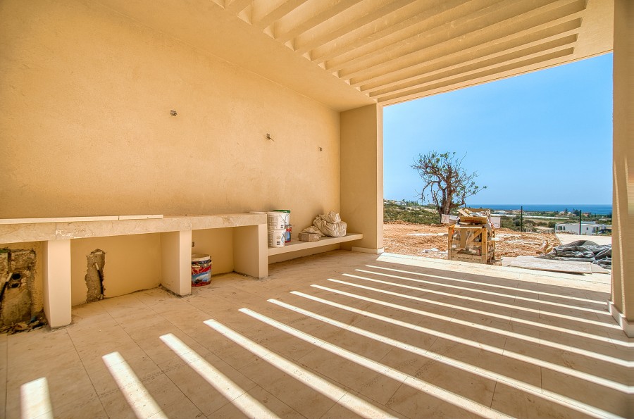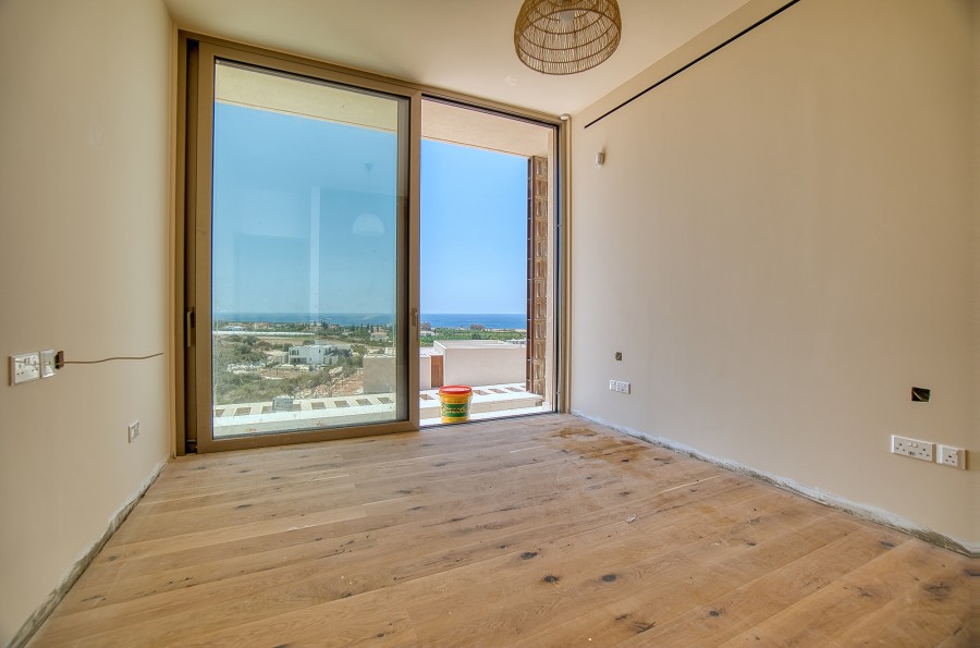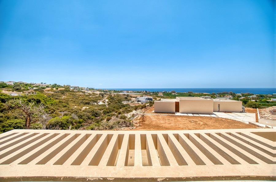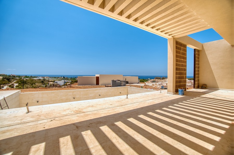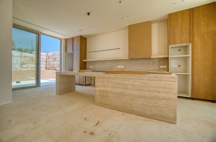 The development was designed so it would complement and be complemented by the immediate surroundings. The development is at the top of a small canyon with one of the properties accessed via a road that leads down into the canyon to a lower-level plot. The area is mainly scrub, grassland and trees with areas of open cream or white limestone. The development follows the pattern of the landscape in being planted with mature trees and with a garden that blends with the natural vegetation. The soft natural colours of the exterior, highlighted and yet softened by the use of terracotta screens and natural wood panelling lead seamlessly into the interior living space transitioned through a spacious outdoor living area. The exterior colour scheme and use of wood is continued inside with soft sand-coloured walls and ceilings highlighted with walnut doors and soft, warm downlighters that are unobtrusive yet effective in producing a homely feel during the winter nights. Internally, the feeling of luxury is highlighted with travertine marble panels used in the bathrooms and as a headboard for the bedrooms. As well as being a luxurious touch, marble is renowned for its cool touch and helps reduce the temperature as you sleep. Walnut finish doors are fitted to each room as well as the closets. In places, walnut panelling is added as a feature and adds to the feel of bringing the outside in, mirroring the exterior finishing touches. High quality marble tiles adorn the floor throughout the properties whilst Italian-designed and manufactured ceramic tiles are used above the granite work surfaces in the kitchen, in complementary shades. The kitchen is fitted with high-spec cabinets and electrical appliances from top European manufacturers. Finally, the landscaping of the project has been carefully considered so the mature tree planting is in tune with the naturally occurring greenery. Smaller shrubs also reflect the environment, chosen from species endemic to Cyprus. For ease of maintenance, an automatic watering system is in place and for sustainability, a lining and gravel covers the ground to reduce water loss through evaporation.