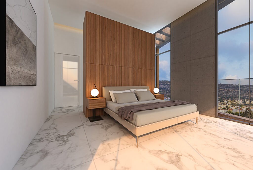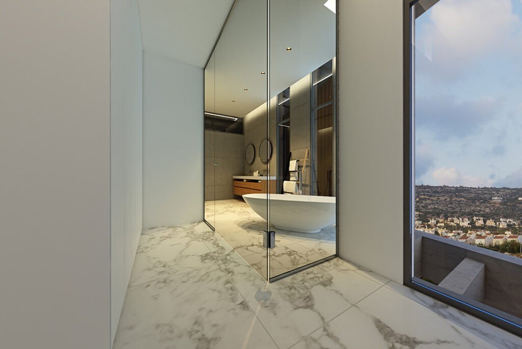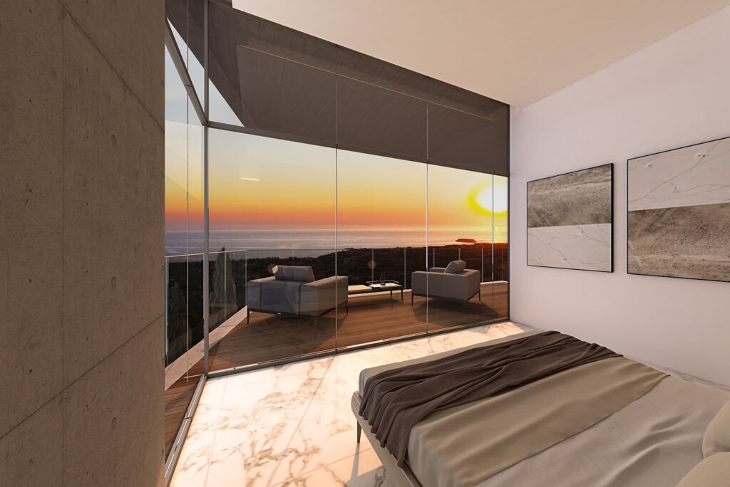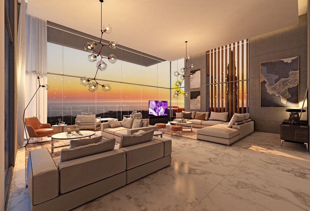 The villa has a bright and airy open plan living room,comfortable lounge area with floor-to-ceiling windows for panoramic views and finished to a very high standard with luxurious marble and high quality fittings.