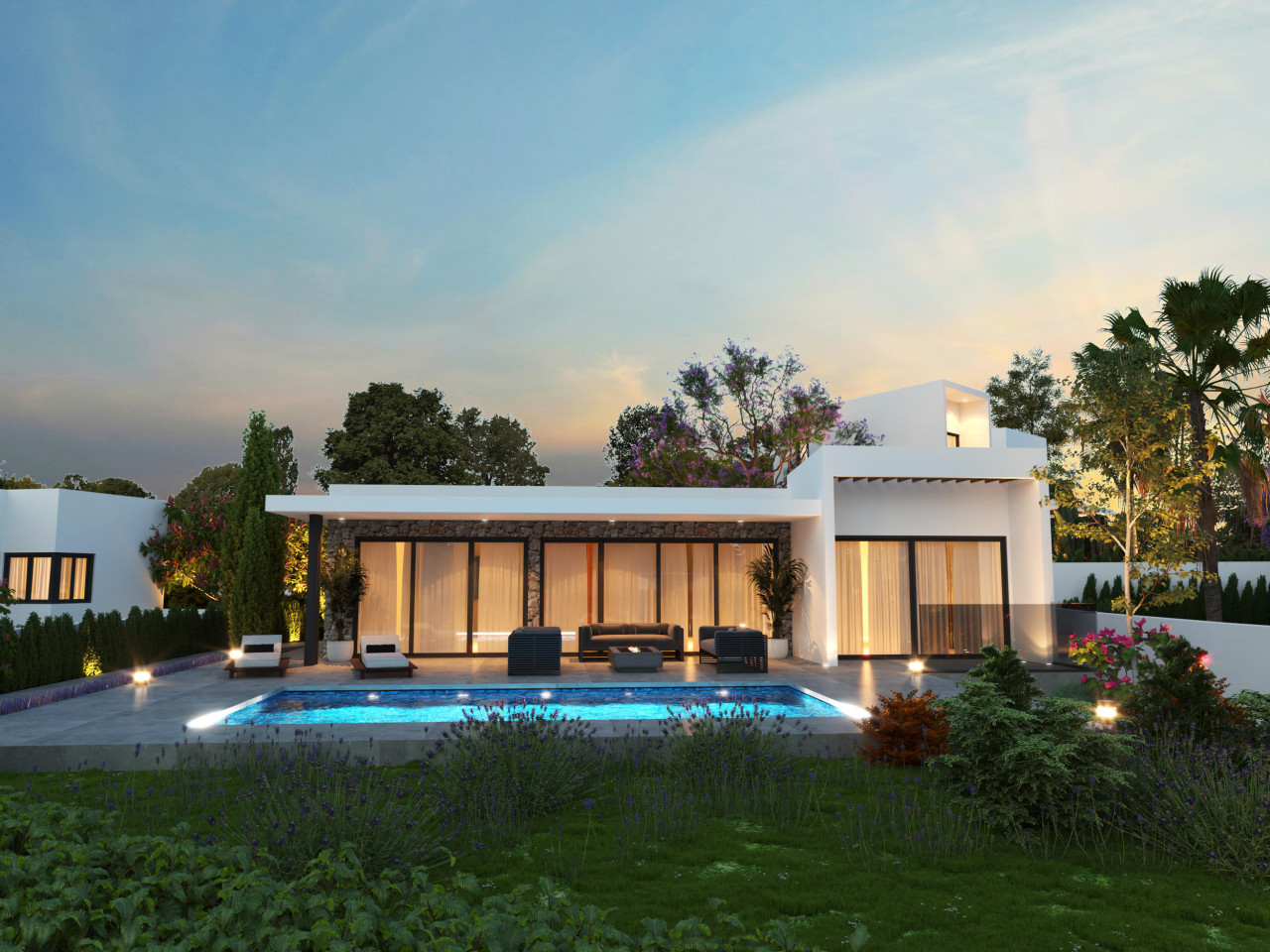 The villas are designed for seamless indoor-outdoor living and boast all amenities including a custom swimming pool and a covered outdoor dining area.
