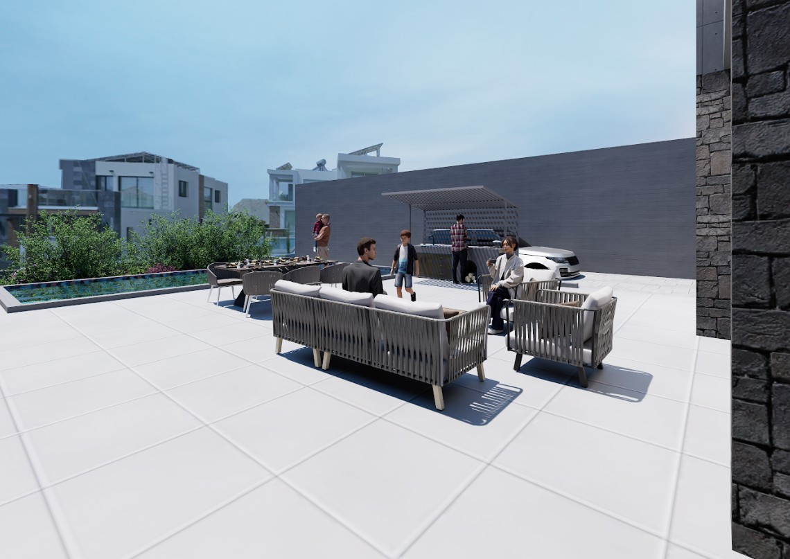 The villa includes 4 comfortable bedrooms and 3 modern bathrooms. The property boasts a private swimming pool surrounded by landscaped outdoor spaces. Expansive balconies and a private rooftop terrace further enhance the living experience, offering beautiful sunset and sea views.