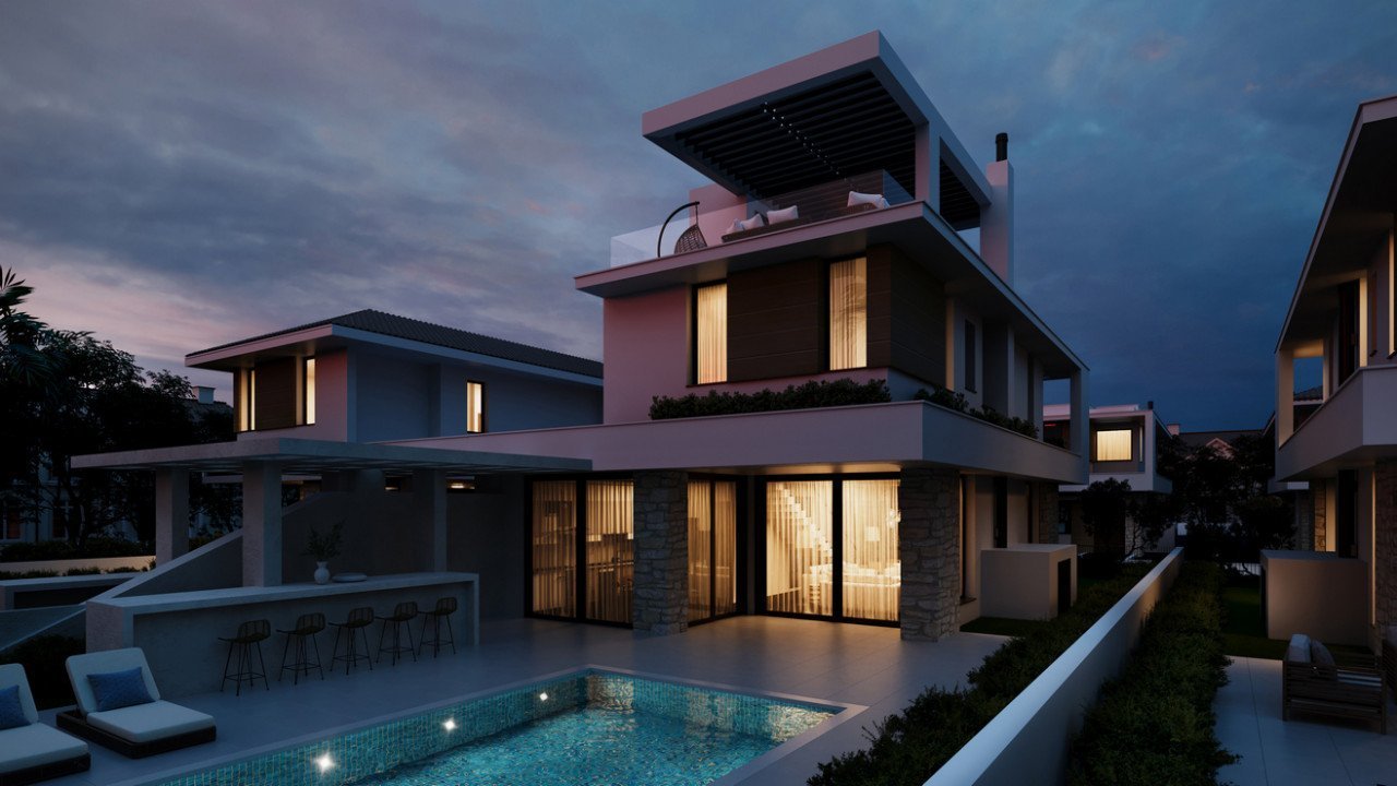 Modern gated complex in Larnaca tourist area in Pyla. The project consists of 16 vilas with swimming pools.