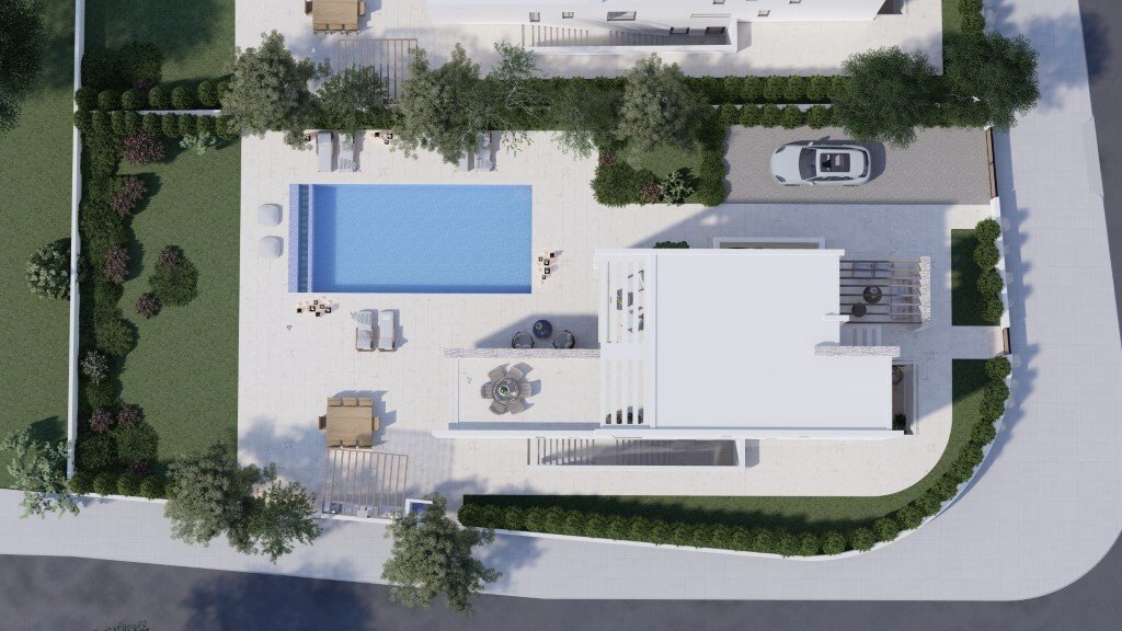The villas are flooded with natural light and open onto a multifunctional outdoor space with a large private pool, pergola with seating, and sunbathing area.