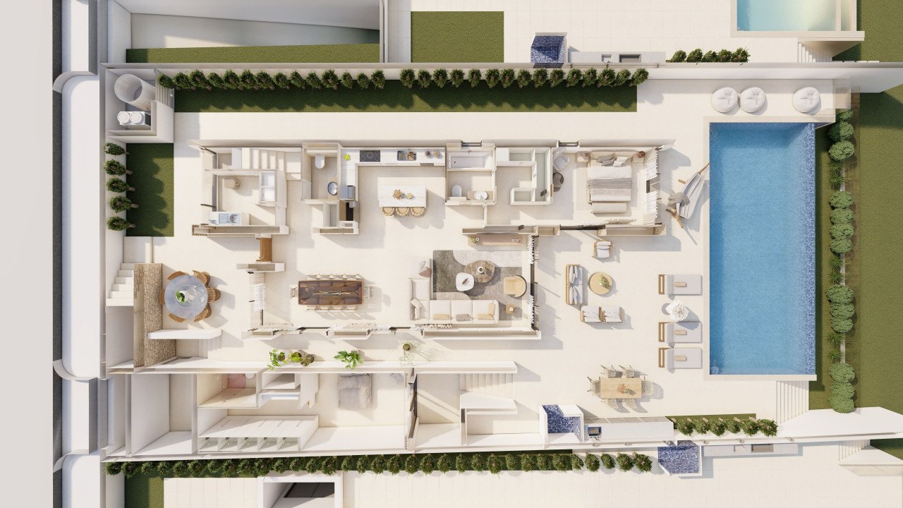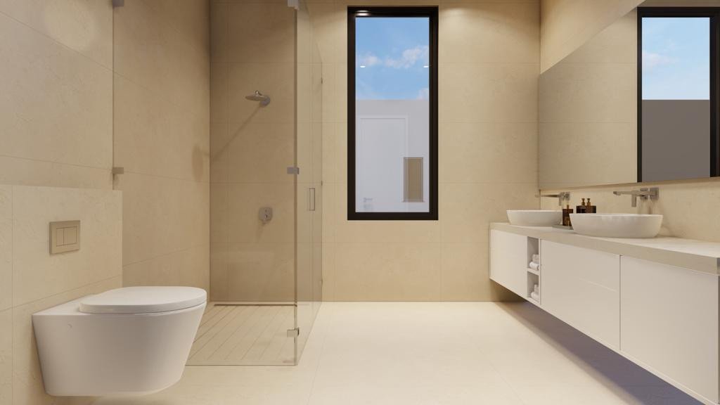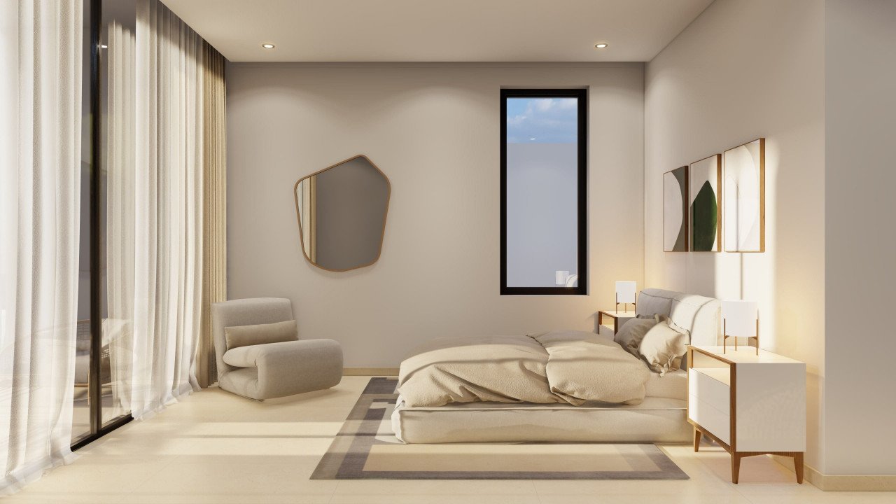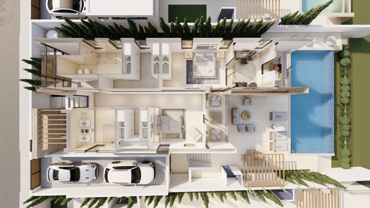 The villa features a bespoke design with 3 large spacious bedrooms, all with en suite bathrooms and walk in closets within the main villa and an additional seperate guest room with seperate entrance adjoins the property.