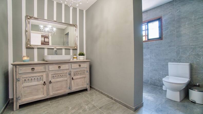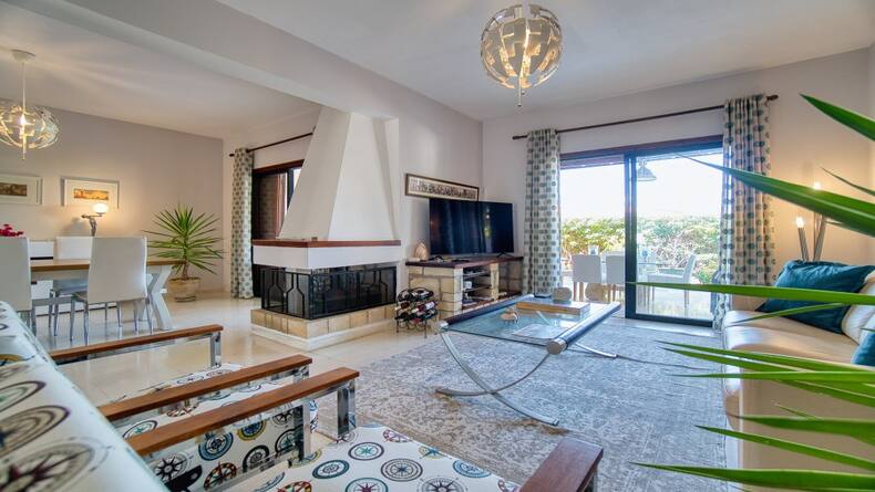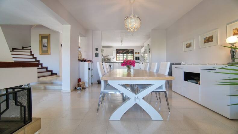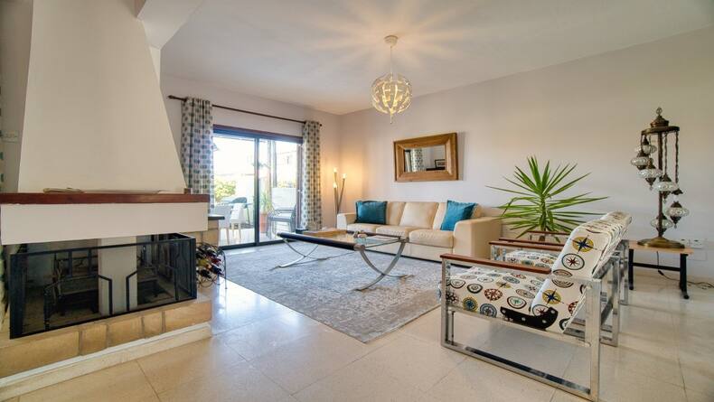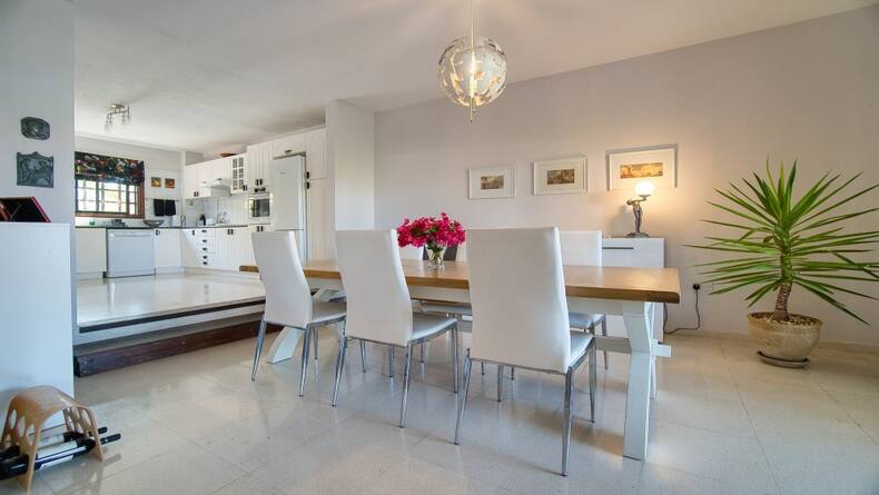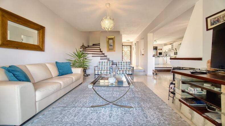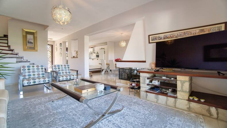 This spacious house is conveniently located in the quiet and popular village of Tala and is offered for sale in immaculate condition. The property, which is located in the lower part of the village of Tala, consists of three floors and has four good sized bedrooms and three bathrooms or shower rooms, as well as a basement with a spacious entertaining area. The villa is one of the surrounding villas with a communal swimming pool. There is private parking in front of the house with a walking path to the supermarket, which is located a few steps from the house. This spacious, air-conditioned home features patio doors leading out to a secluded private deck and further to the community pool located just off. The main rear patio can be used for barbecuing or for enjoying your morning coffee overlooking the pool. The bright and spacious living room with fireplace is connected to the equipped kitchen and spacious dining room, which has enough space for a large dining table for 6 or more people. There is a large range of modern kitchen units for storage and large granite worktops. On the second floor there are four bedrooms, the largest of which is the master bedroom with a spacious bathroom. The master bedroom also has fitted wardrobes, air conditioning and a balcony overlooking the sea and the picturesque communal pool. The other two bedrooms have large double beds and share a family shower room. All of these bedrooms also have mountain and sea views. All doors and windows have blinds. The ground floor consists of one large but divided room that can be used for private use as anyone sees it.